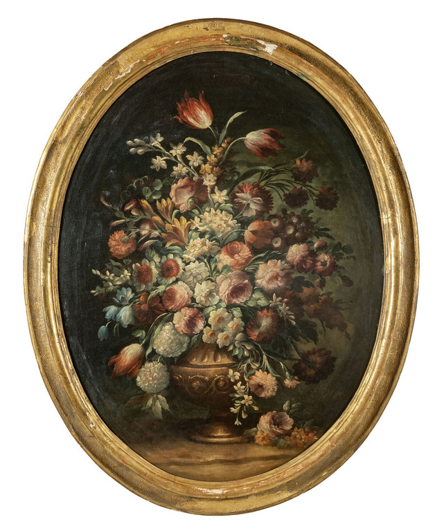 Scuola italiana sec.XVIII 'Fiori' olio di forma ovale cornice antica in legno intagliato e dorato