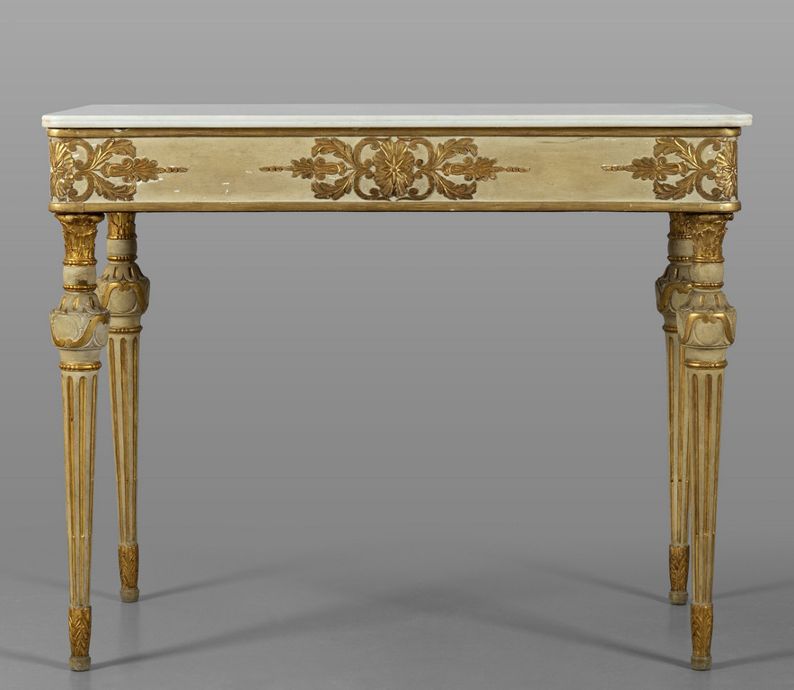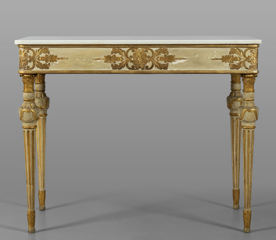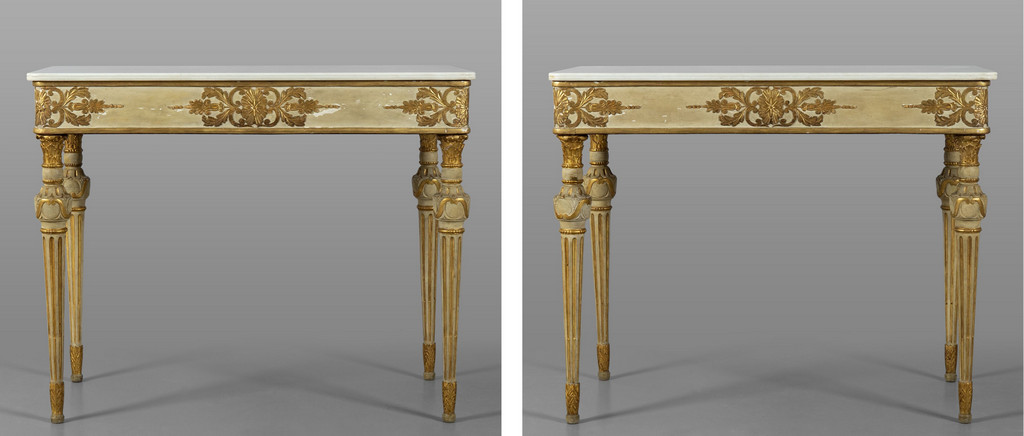 Coppia di consoles Luigi XVI in legno intagliato dorato e laccato piano in marmo bianco Napoli sec.XVIII