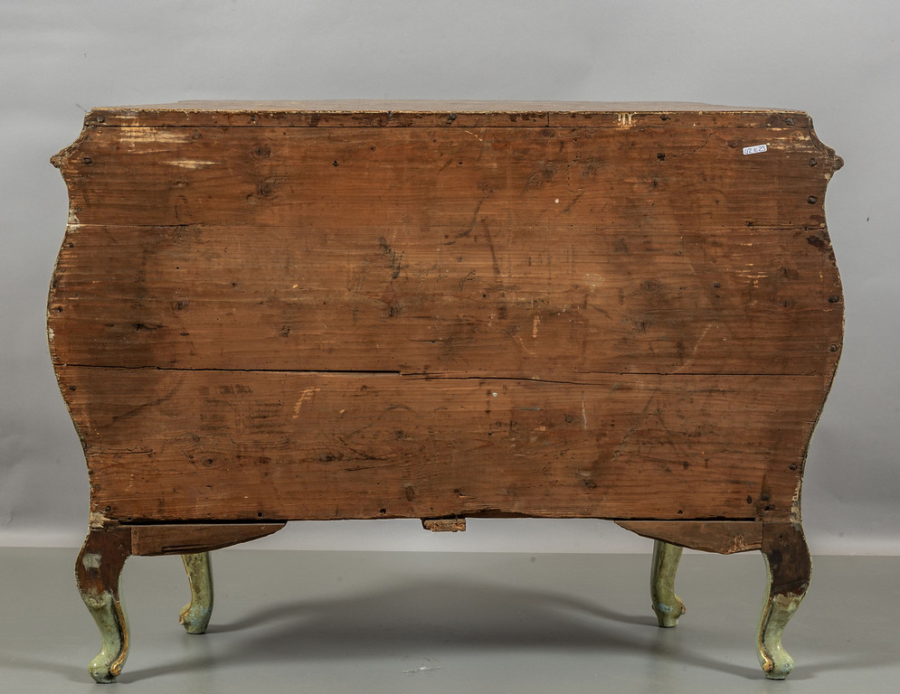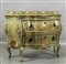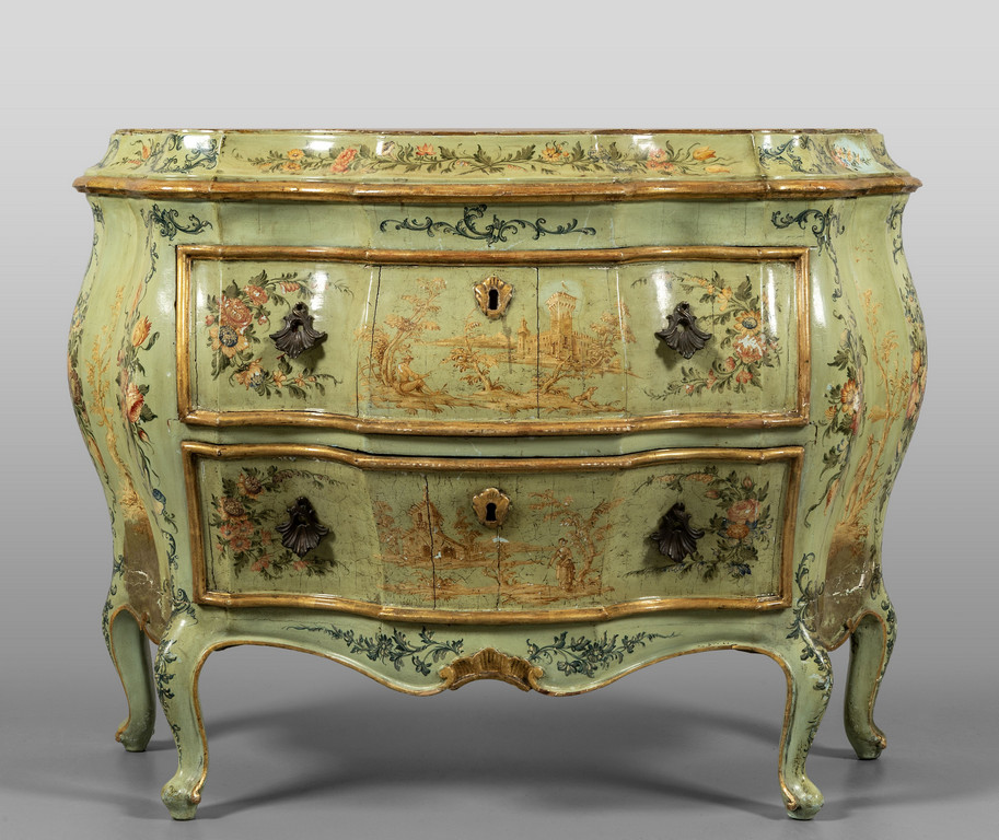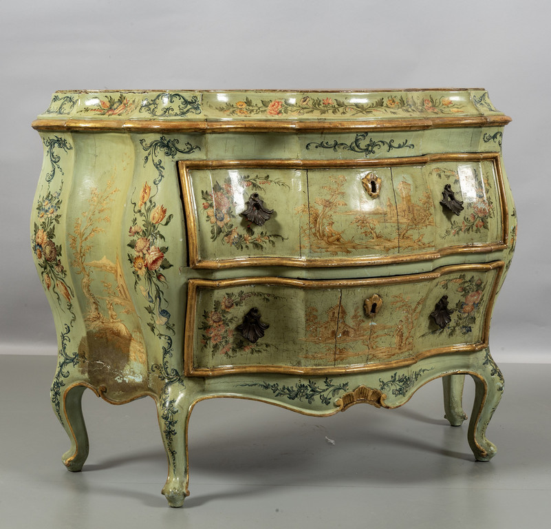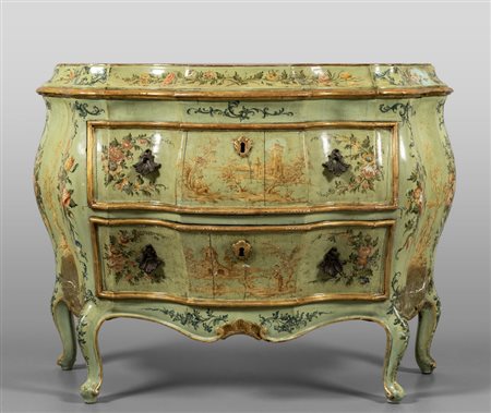 Comò Luigi XV in legno intagliato e laccato in policromia a fiori con paesaggi Venezia sec.XVIII