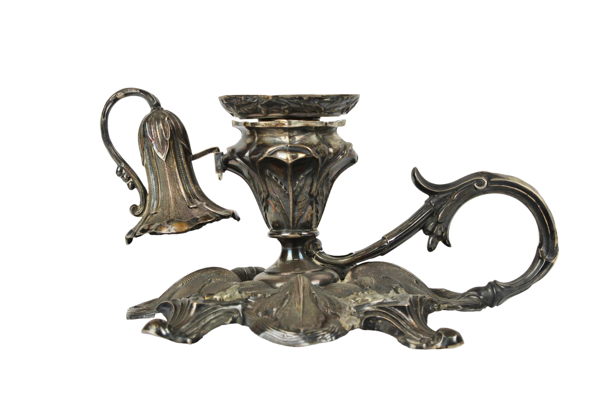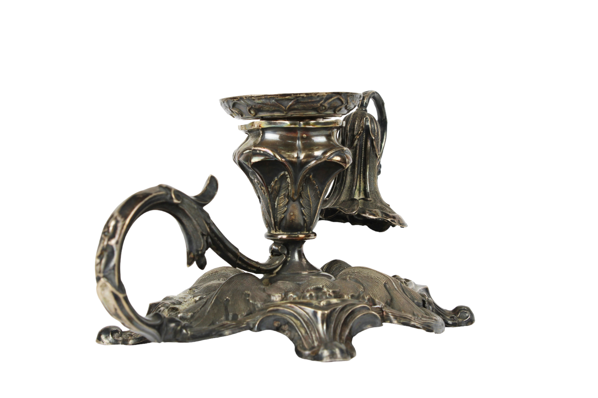 BUGIA in argento sbalzato di gusto settecentesco, difetti e restauri manifattura italiana primi XIX secolo h cm 10 x 17 x 13