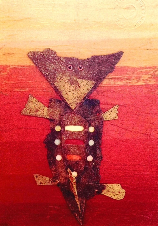 "Lagarto" 1969 Collage su tavola cm. H: 92.00 L: 65.00 Titolo, firma ed anno al retro. Verbale di perizia su foto nr. A36, rilasciato dalla Galleria Pace a firma di Gimmi Stefanini, perito d'arte del tribunale di Milano e della Lugano.