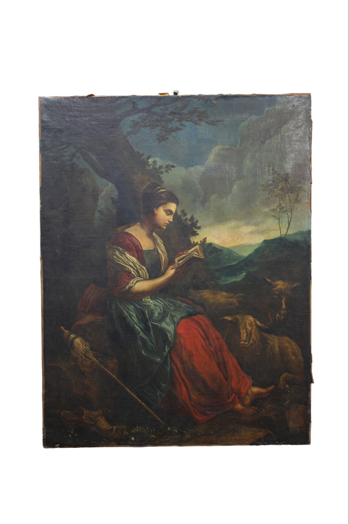 OLIO SU TELA raffigurante Santa Agnese in lettura con armenti firma illeggibile fine XVIII primi XIX secolo h cm 118 x 90