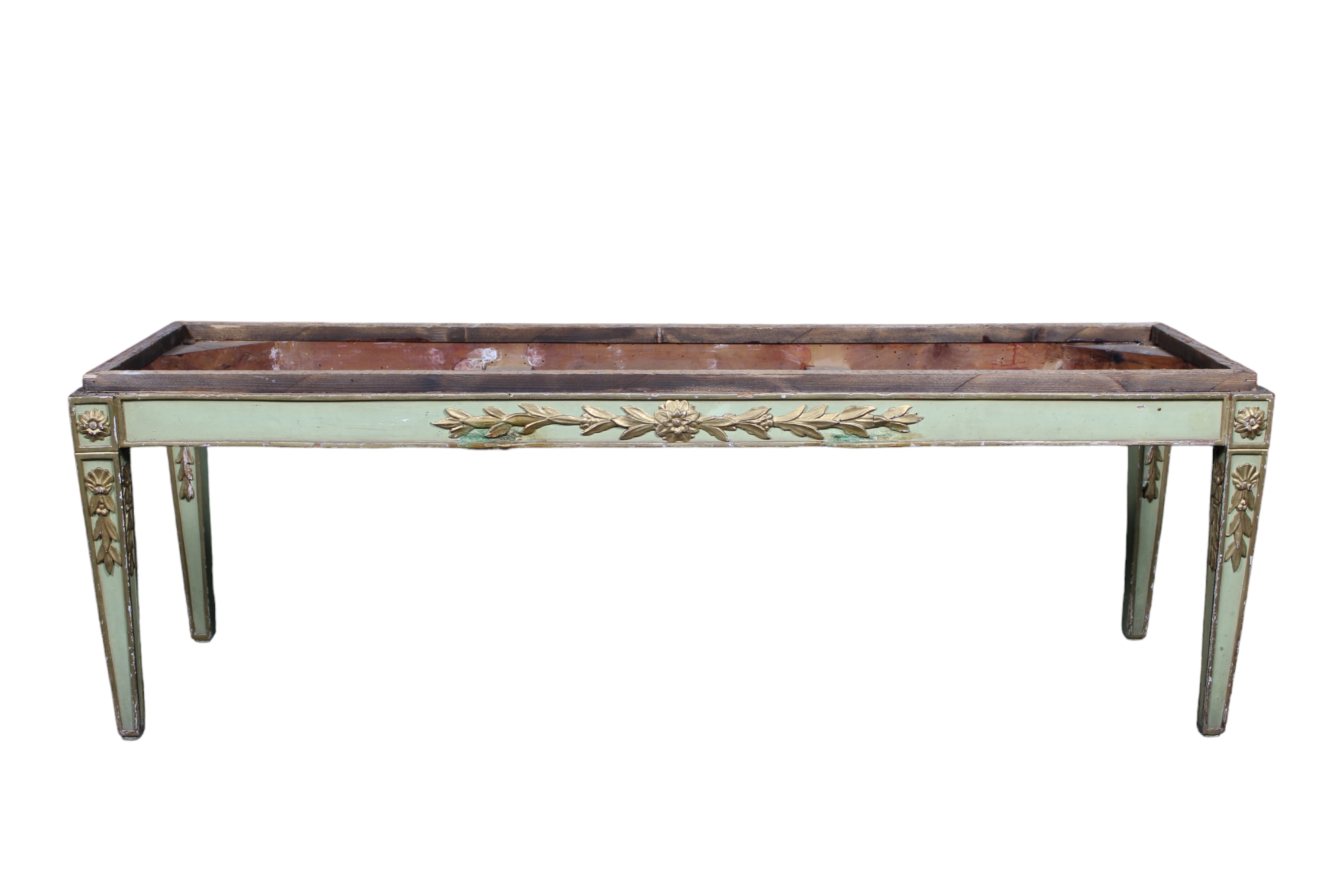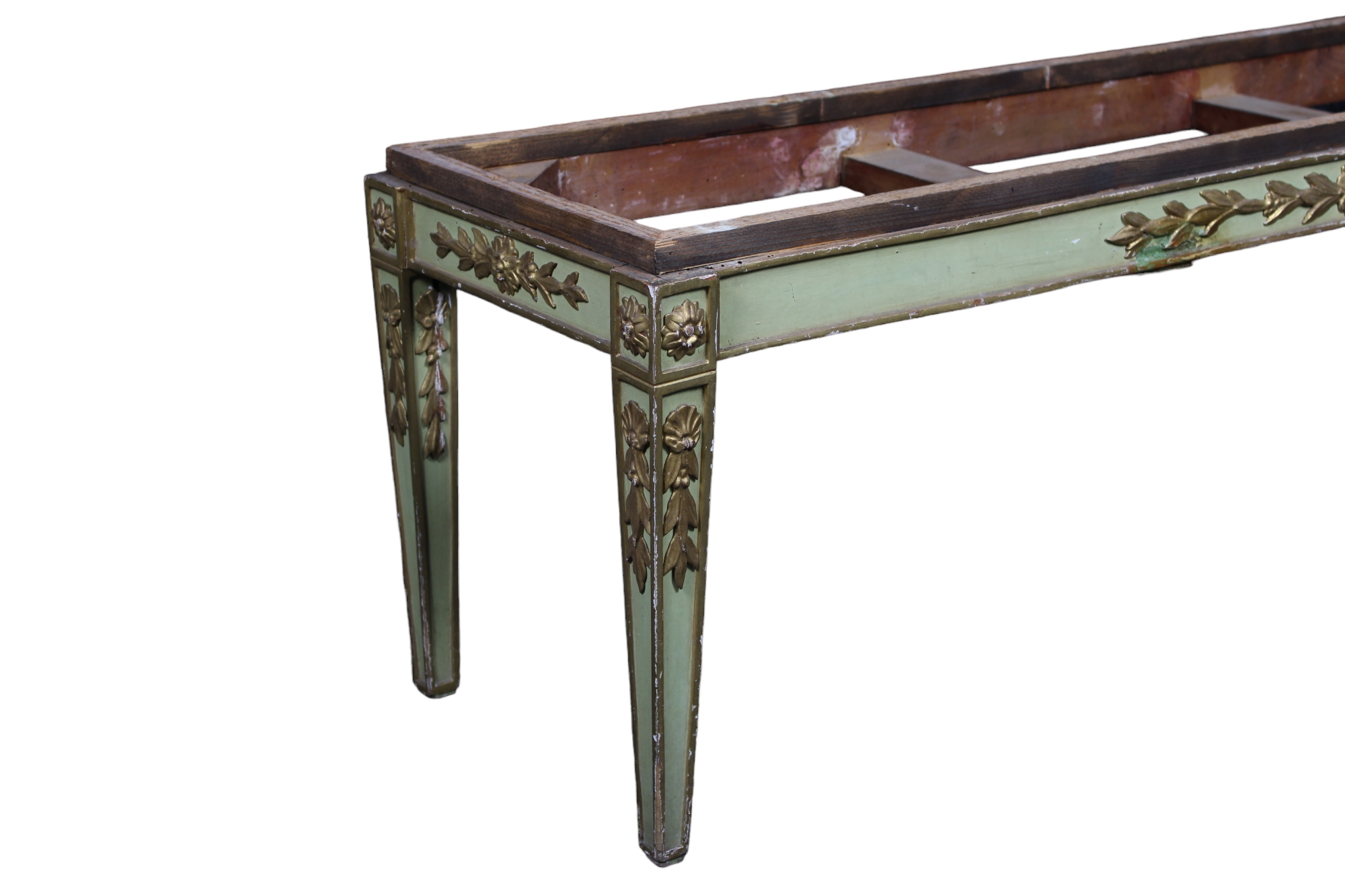 PANCA LUIGI XVI RETTANGOLARE in legno finemente scolpito a motivi floreali laccato e dorato ad oro zecchino Sicilia primi XIX secolo h cm 43 x 128 x 36