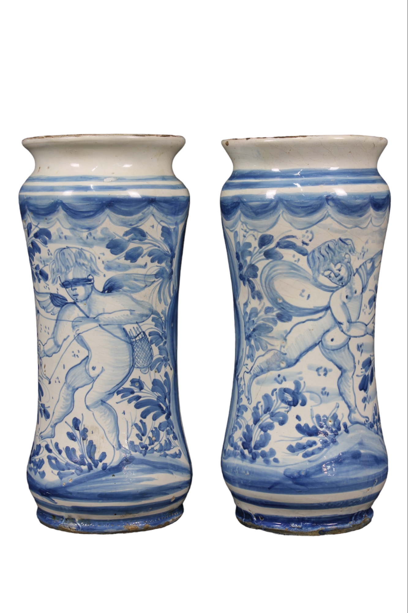 COPPIA DI ALBARELLI in maiolica dipinta raffigurante cherubini maestranze napoletana fine XVIII secolo h cm 25 x 10