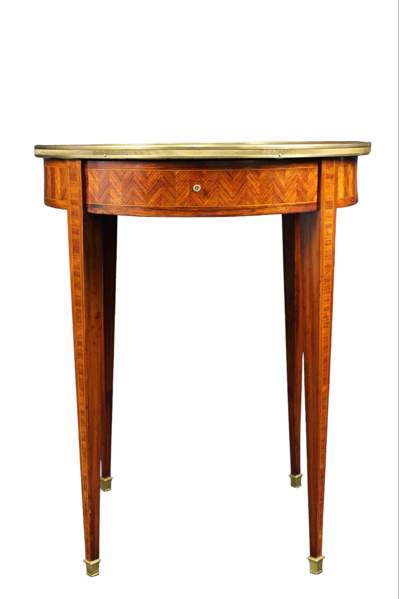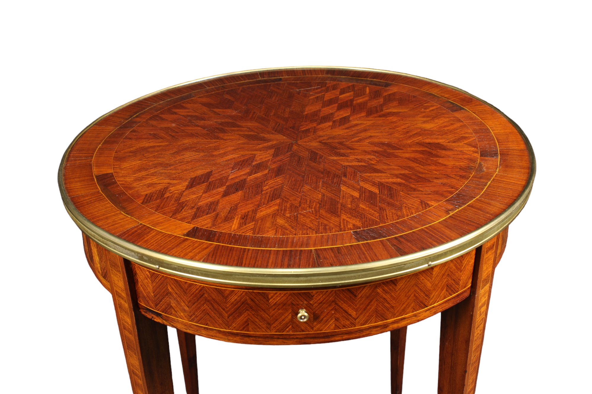 TAVOLINO DA CENTRO DI FORMA CIRCOLARE in legno di palissandro intarsiato a lisca di pesce e perfilato in bosso cassetto centrale e applicazioni in bronzo Francia XIX secolo h cm 73,5 x 60
