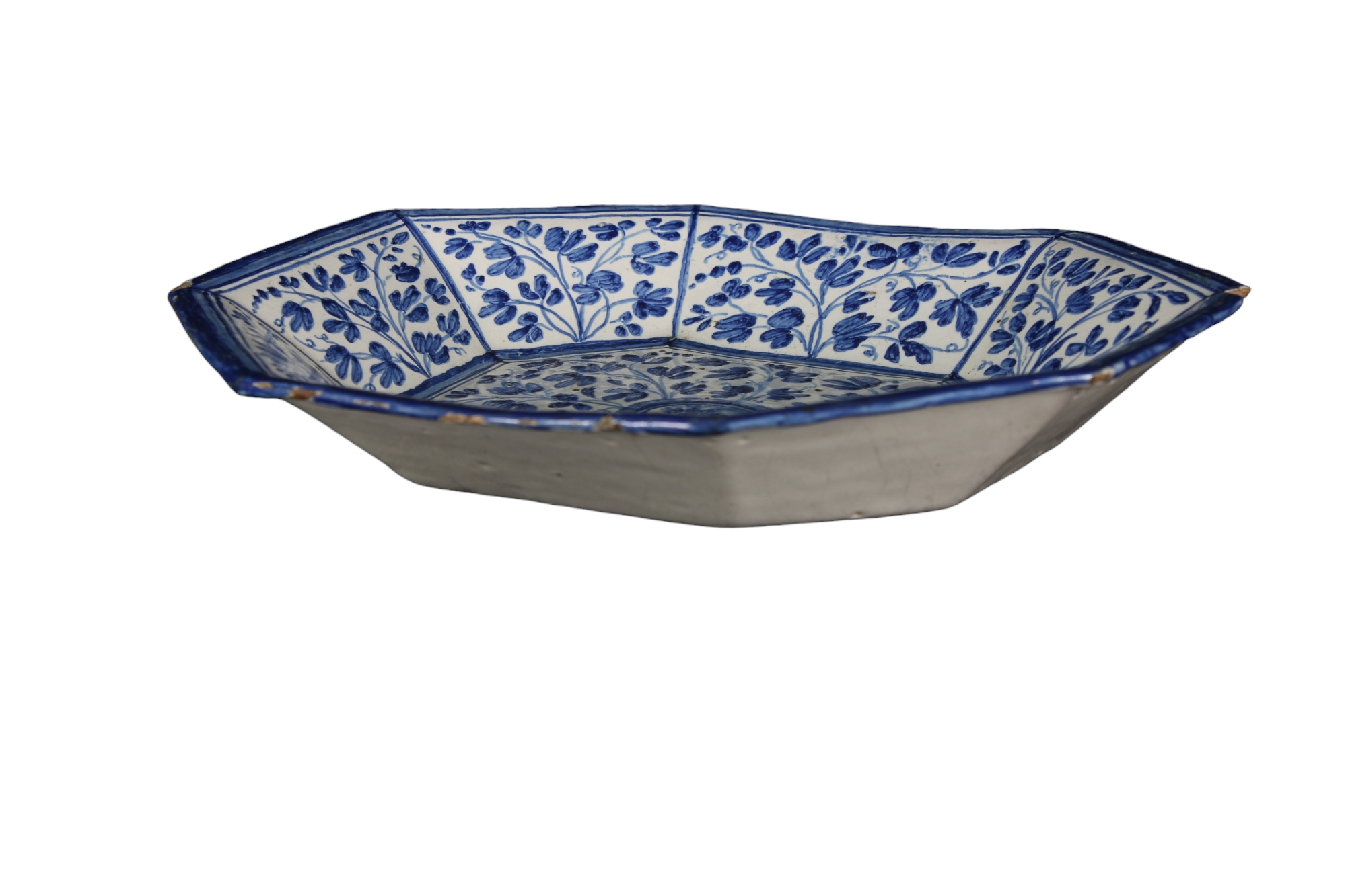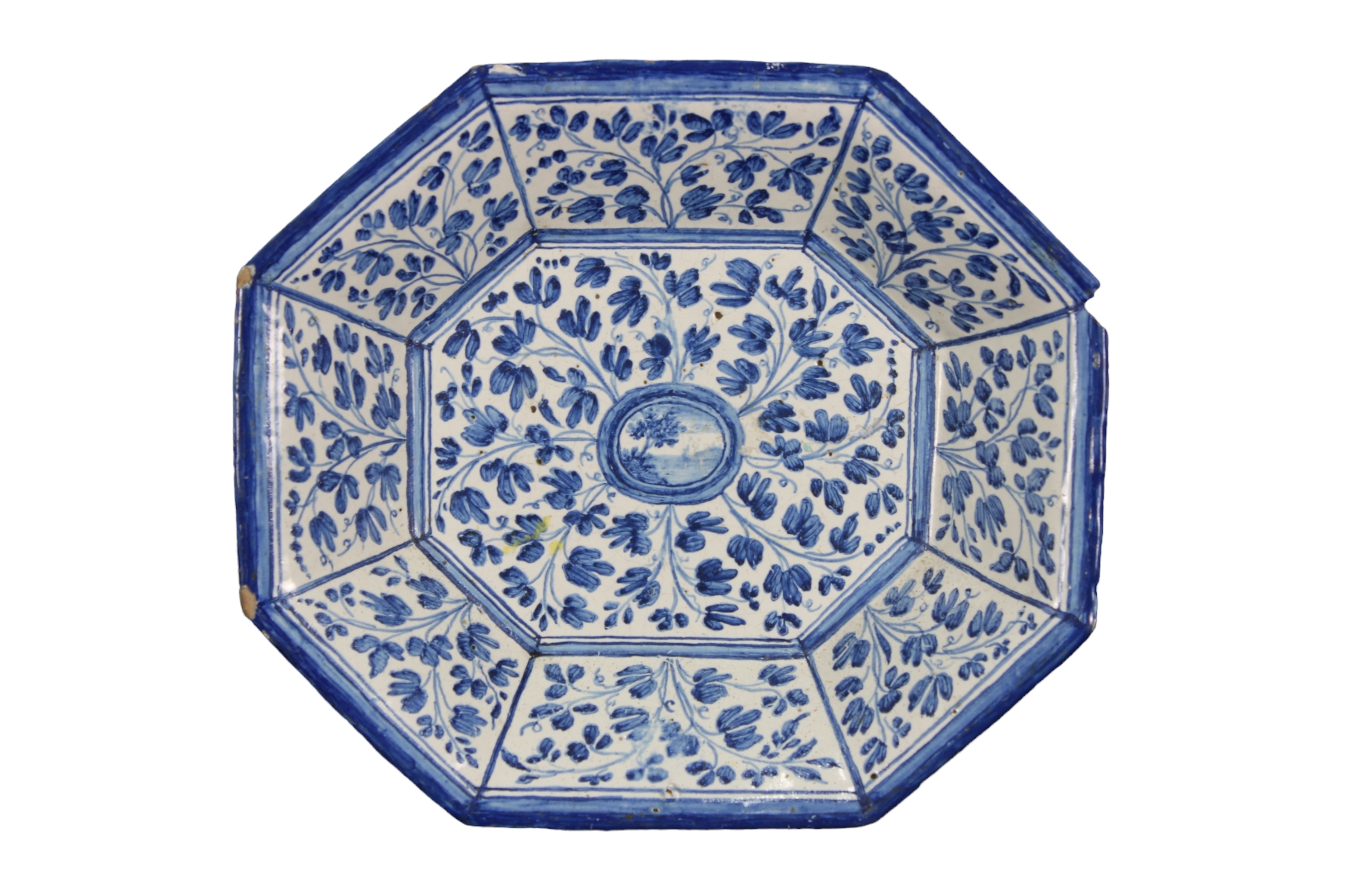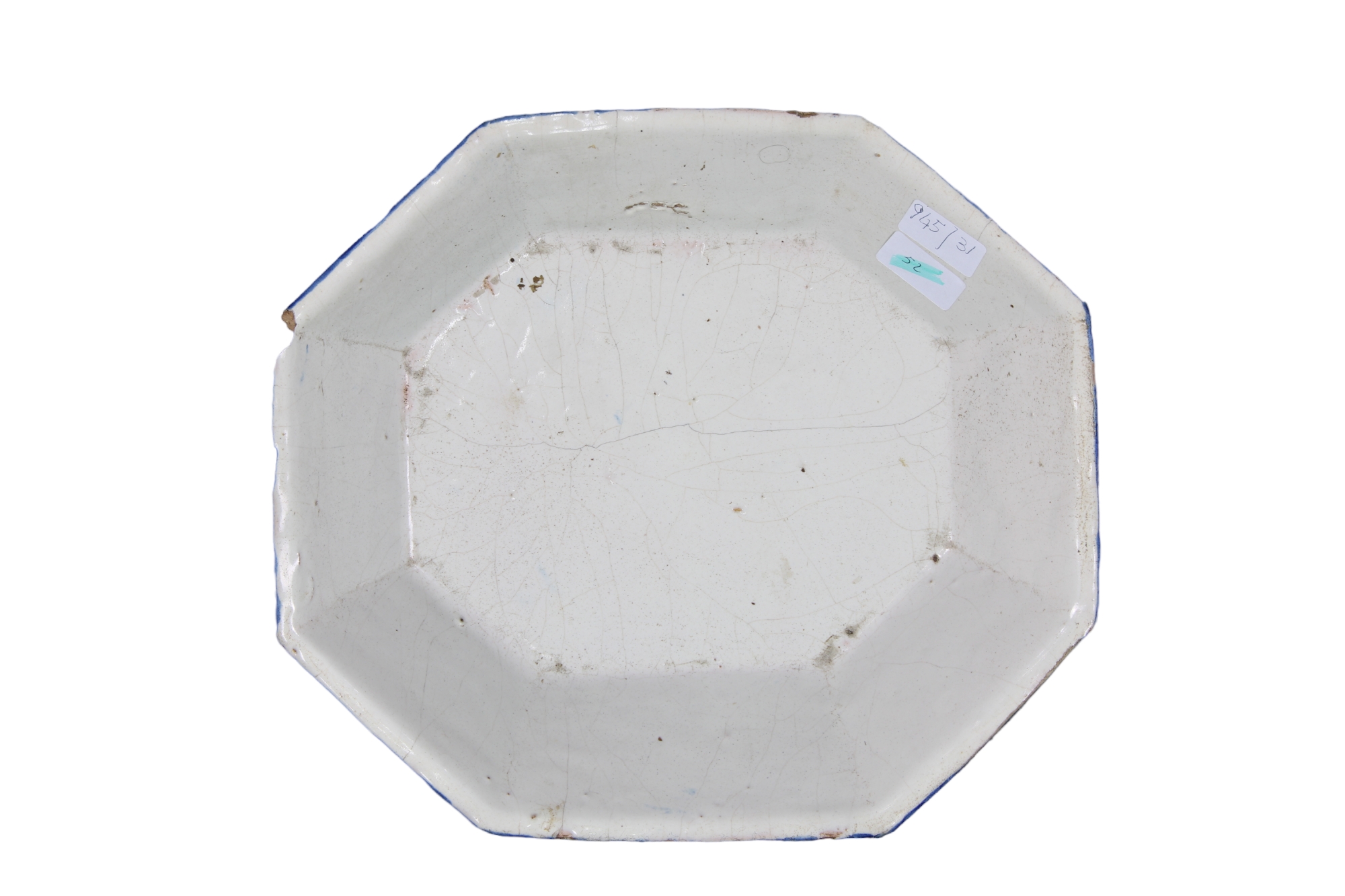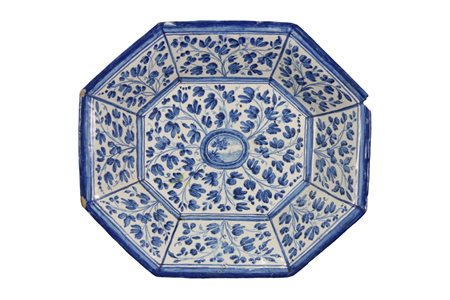 CIOTOLA DI FORMA OTTAGONALE in maiolica dipinta probabilmente manifattura La Terza XVIII secolo h cm 4 x 22,5 x 25,5