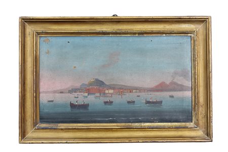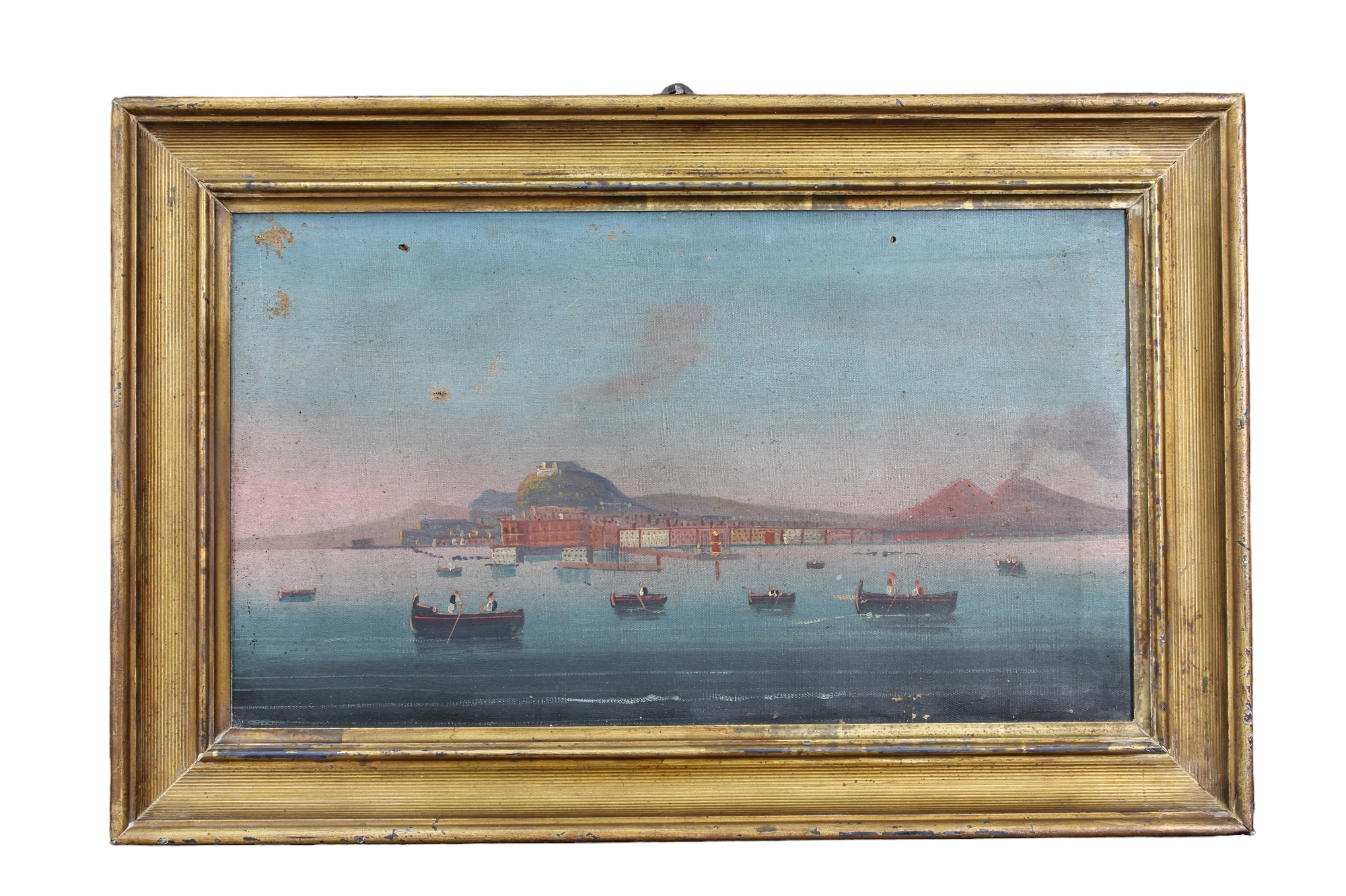 OLIO SU TELA raffigurante Marina del golfo di Napoli con barche e pescatori scuola italiana primi XIX secolo h cm 29,5 x 50 / cornice h cm 42 x 63