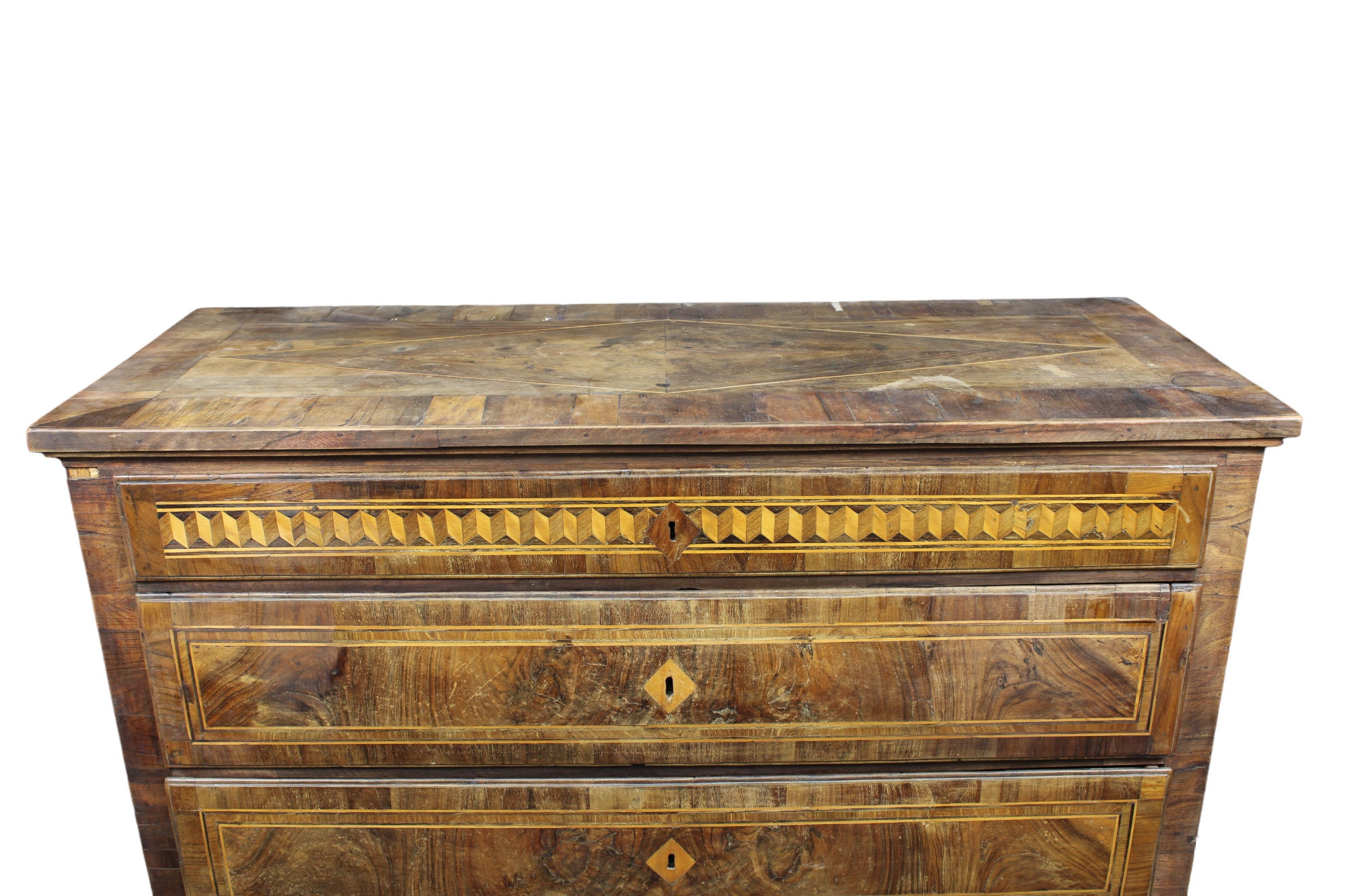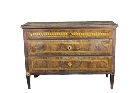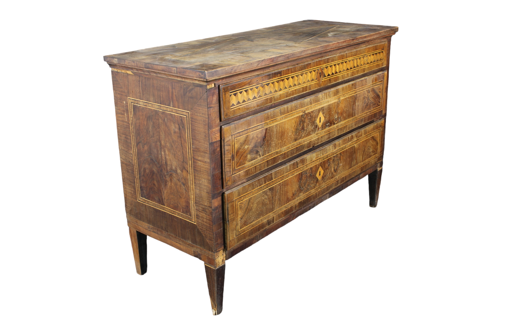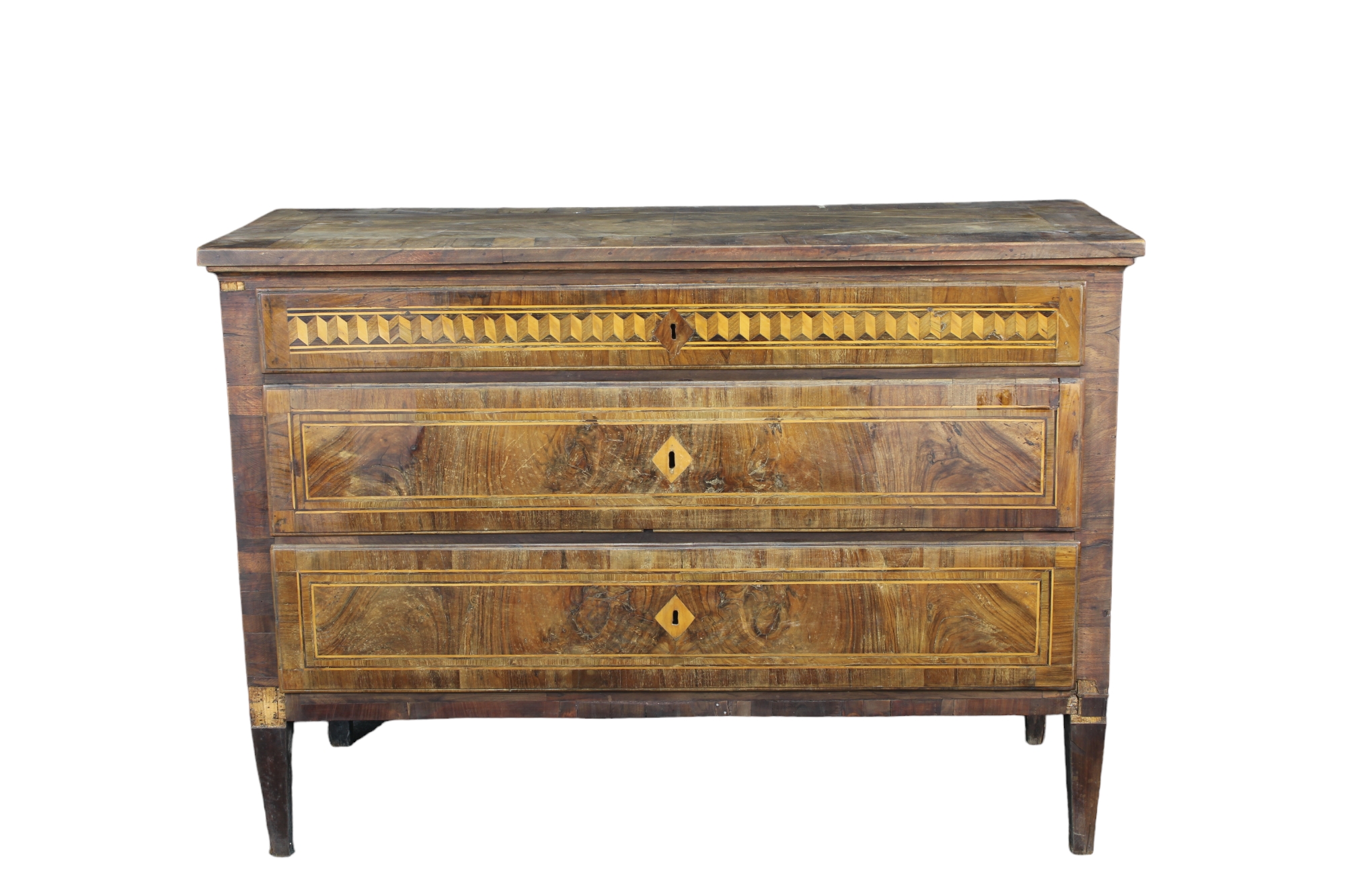 ELEGANTE CASSETTONE LUIGI XVI lastronato in noce e intarsi in varie essenze di legno Sicilia XVIII secolo h cm 90 x 128 x 51