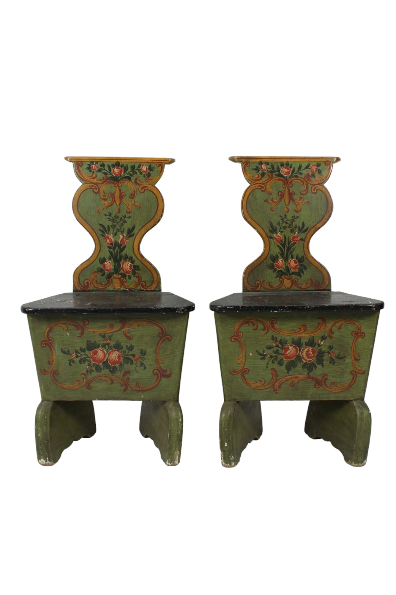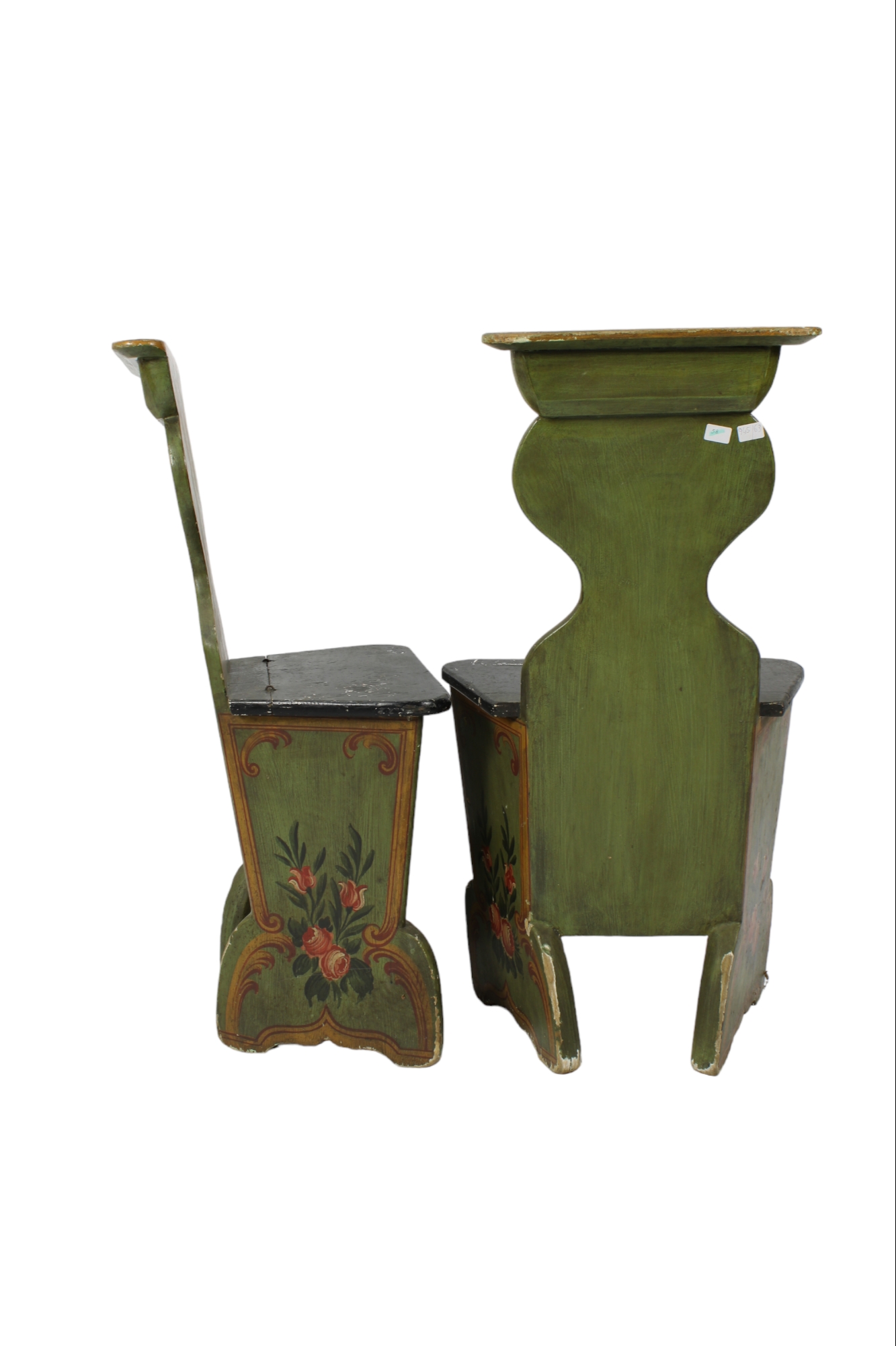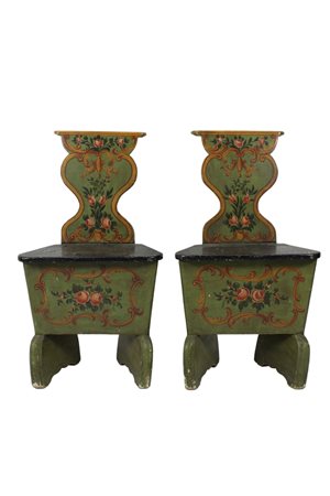 COPPIA DI CURIOSE SEDIOLINE in legno laccato e dipinto a motivi floreali Sicilia XIX secolo h cm 88 x 47 x 35