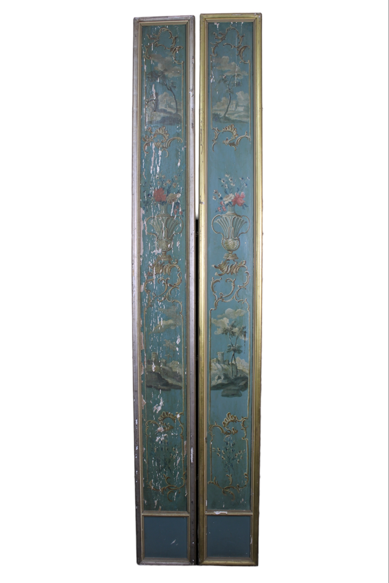 COPPIA DI PANNELLI in legno laccato e dipinto raffigurante paesaggi a motivi floreali dentro cornice non coeva Sicilia XVIII secolo h cm 286 x 33
