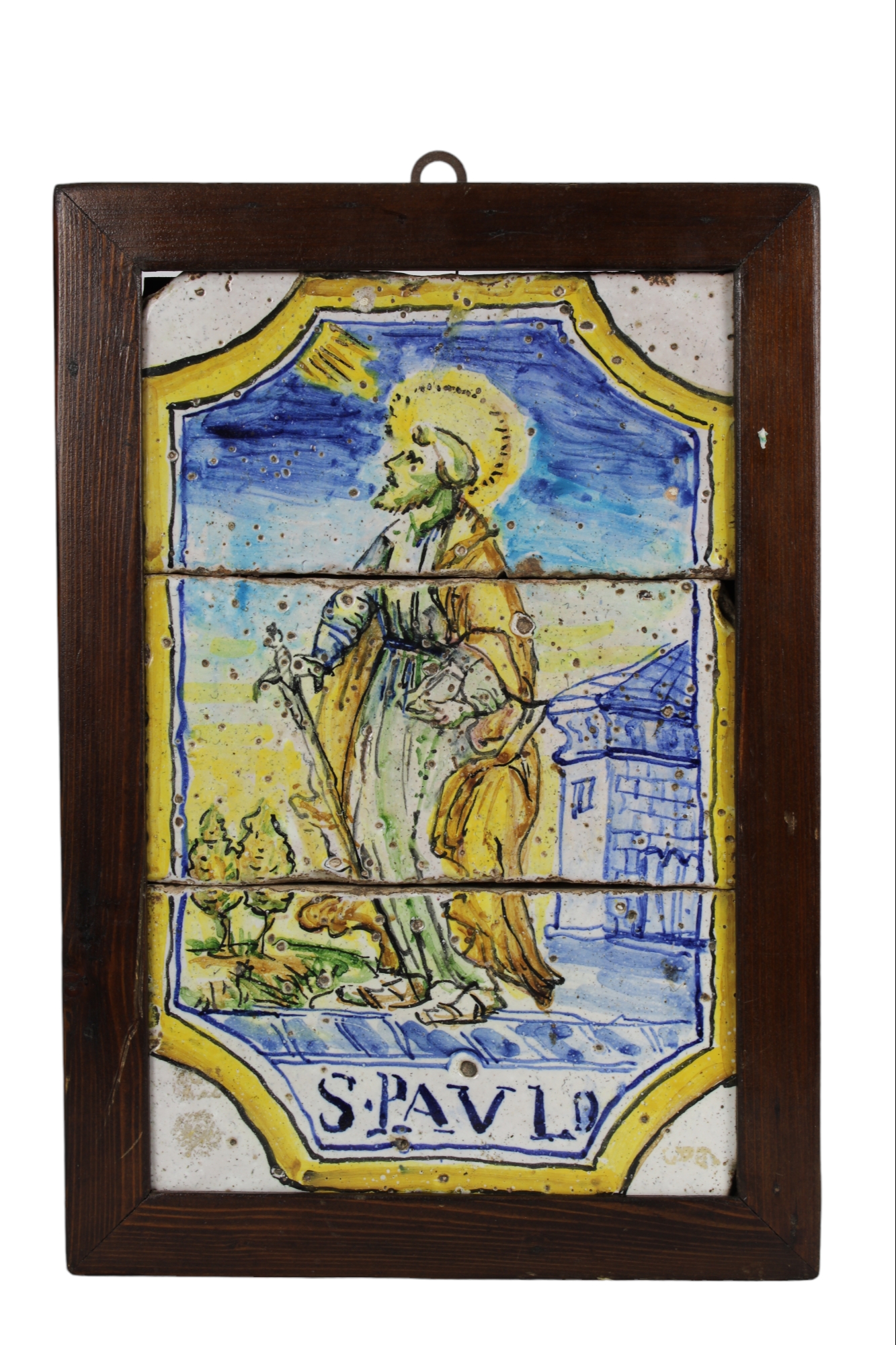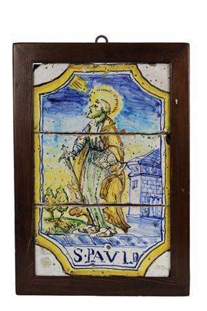 PLACCA in maiolica composta da tre mattonelle, dipinta raffigurante San Paolo dentro riserva manifattura siciliana XVIII/XIX secolo h cm 35 x 22