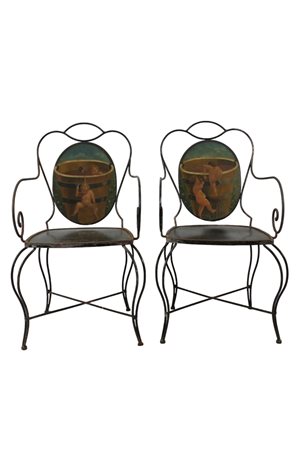 COPPIA DI POLTRONE in ferro con schienale dipinto raffigurante allegoria di putti maestranze italiane XX secolo h cm 102 x 59 x 49
