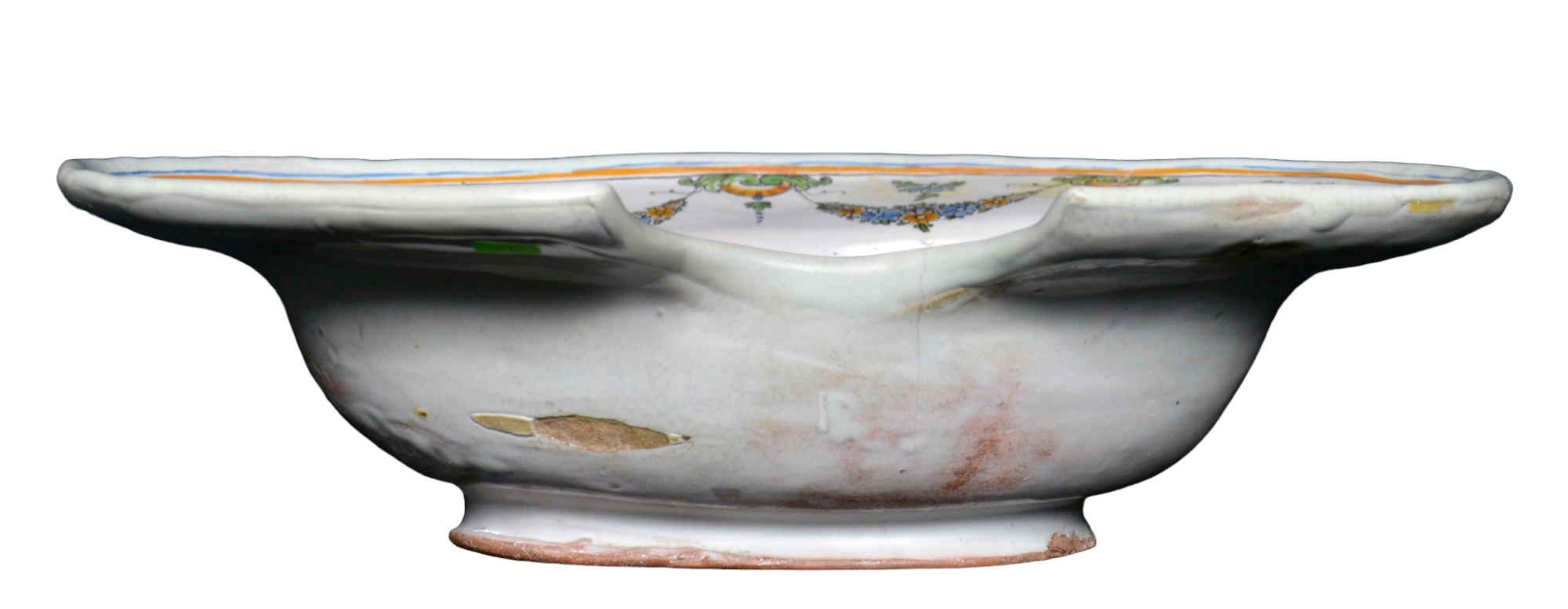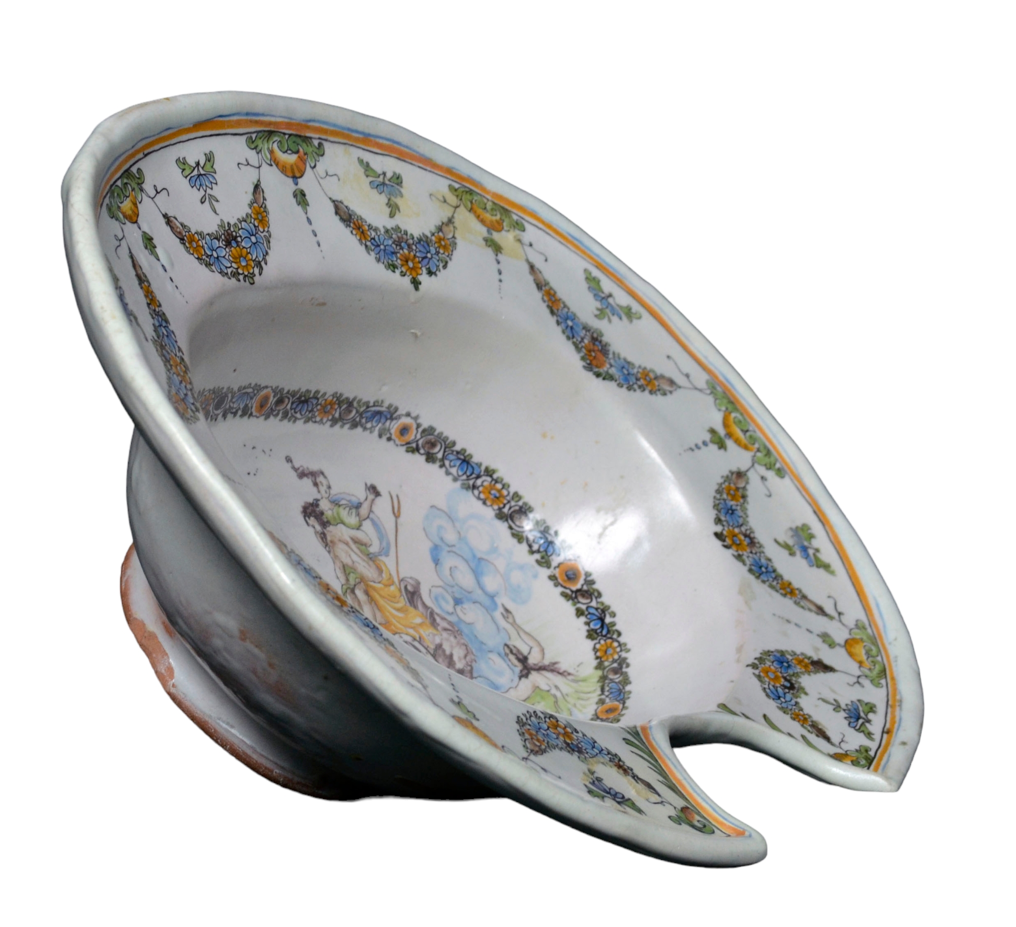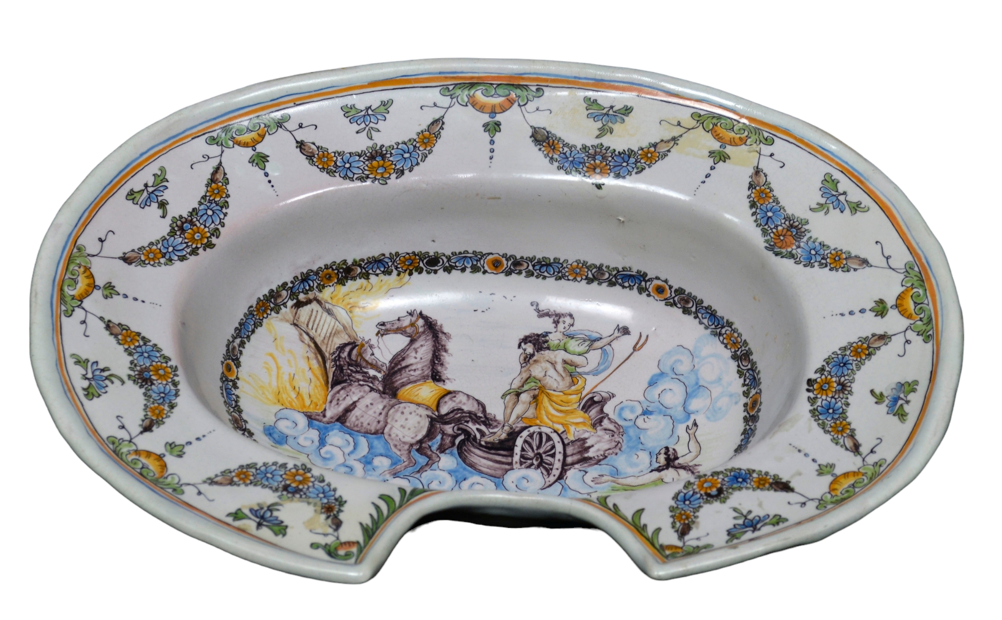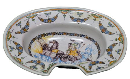 PIATTO DA BARBIERE in maiolica dipinta, ghirlande con riserva raffigurante carro di Nettuno e Anfitrite Bassano XVIII secolo h cm 9,5 x 33,5 x 24