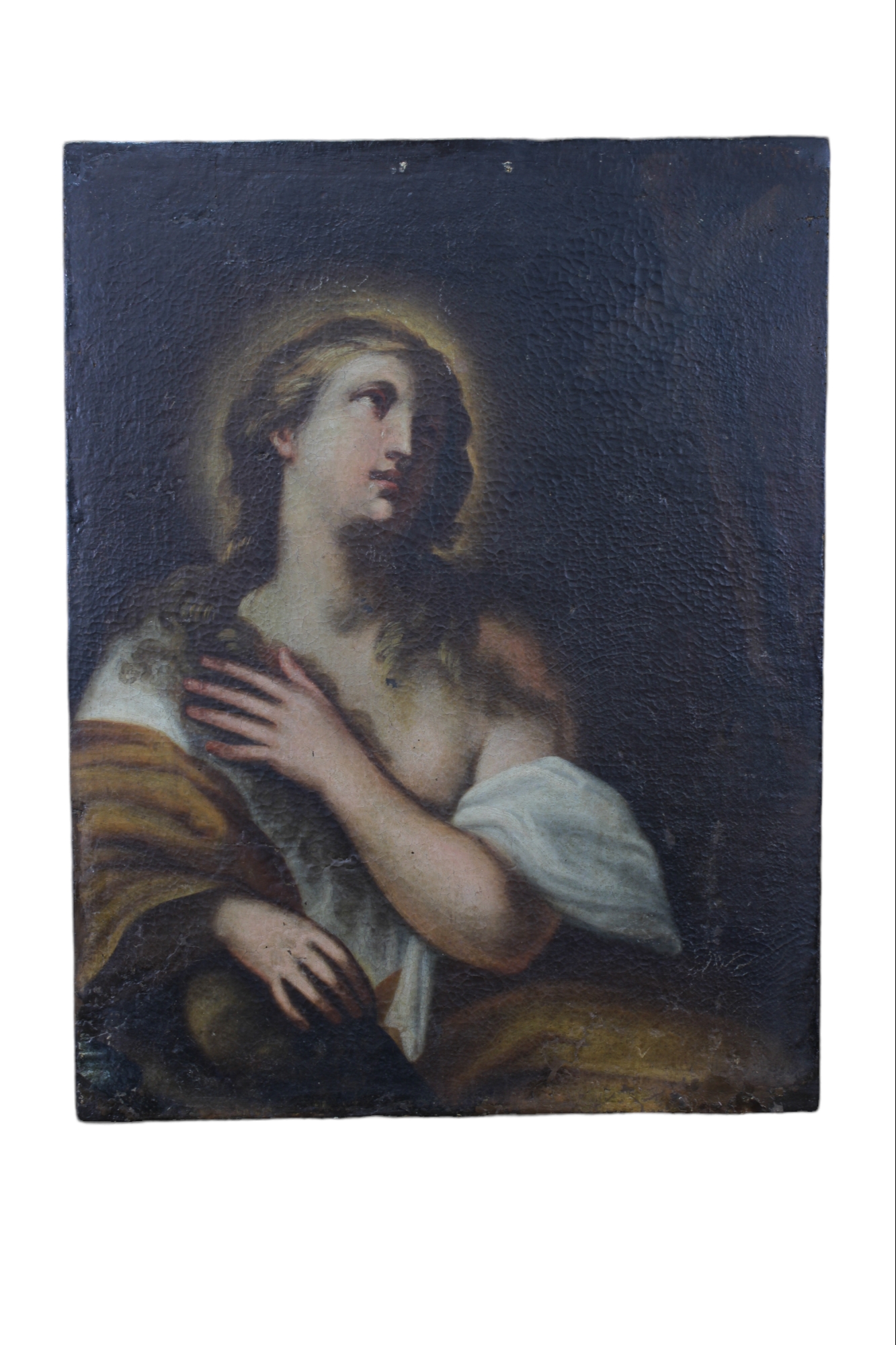 OLIO SU TELA APPLICATO SU TAVOLA raffigurante Maria Maddalena scuola italiana primi XVIII secolo h cm 73 x 56