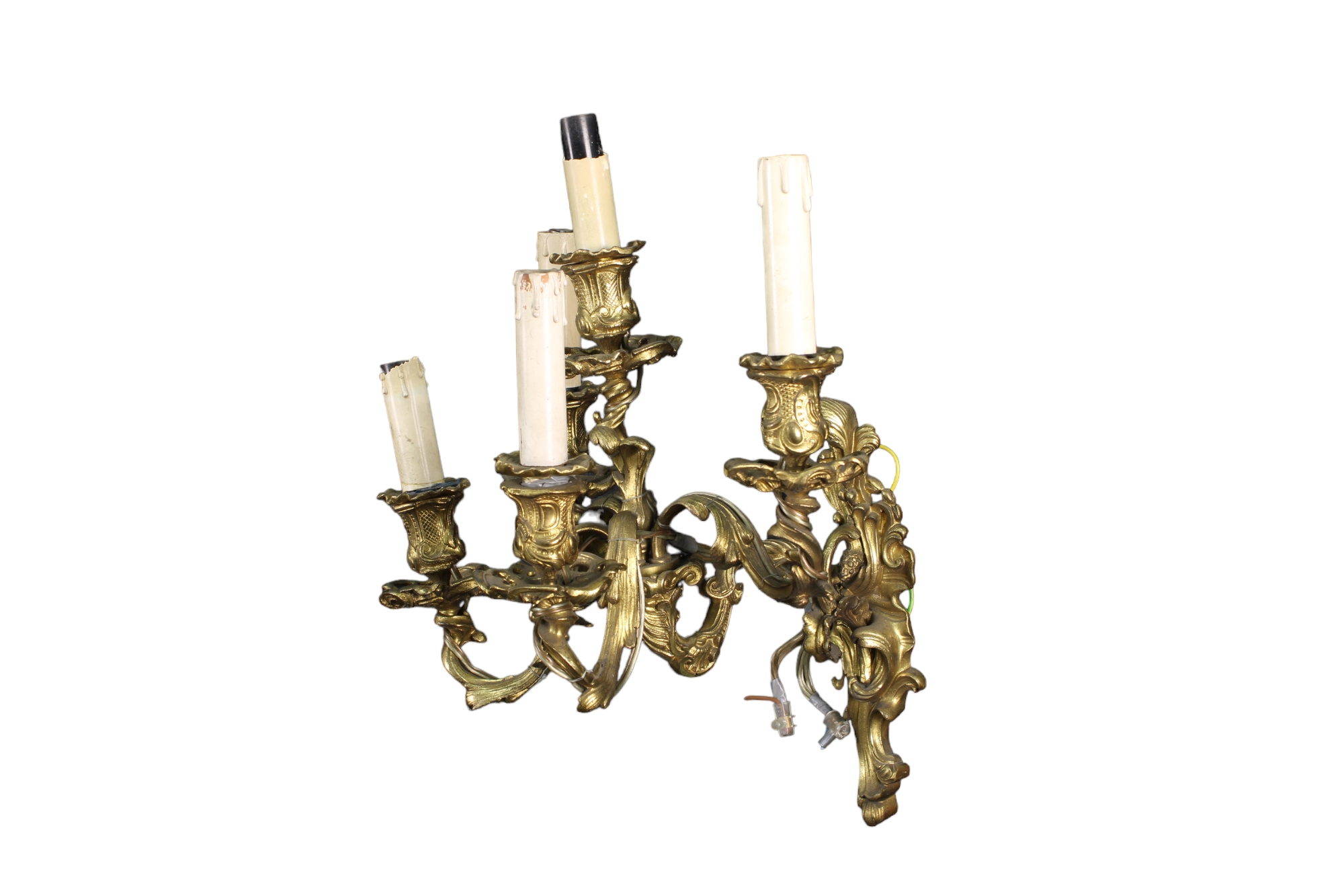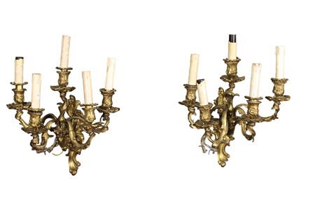 COPPIA APPLIQUES A 5 LUCI in fusione di bronzo finemente cesellato e dorato Sicilia XIX secolo h cm 45 x 36 x 35