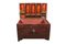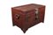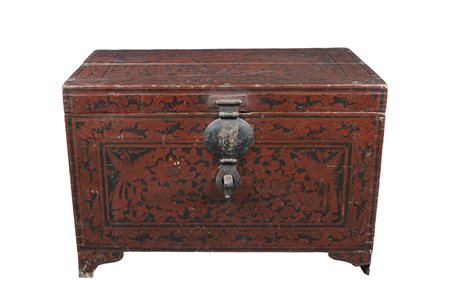 CASSAPANCA DA VIAGGIO in legno laccato e dipinto a fondo rosso a motivi orientali manifattura probabilmente asiatica XVIII/XIX secolo h cm 51 x 76 x 45