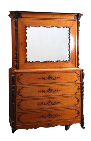 CHIFFONIERE CARLO X in acero fiorito, anta superiore presenta specchio incorniciato da intaglio mistilineo in mogano, spigoli a taglio obbliquo decorati da mezze colonne scolpite, fascia di base con andamento mosso Sicilia XIX secolo h cm 196 x 130 x 55