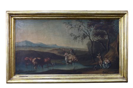 OLIO SU TELA raffigurante paesaggio con pastori e armenti dentro cornice dorata ad argento e mecca e laccata scuola veneta XVIII secolo h cm 55 x 102 / cornice h cm 72 x 120