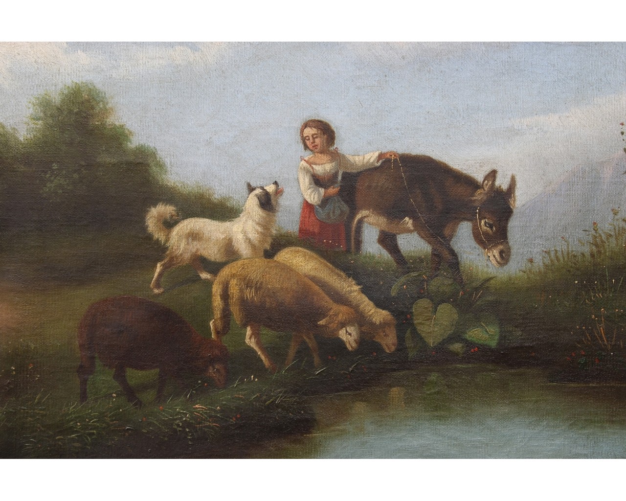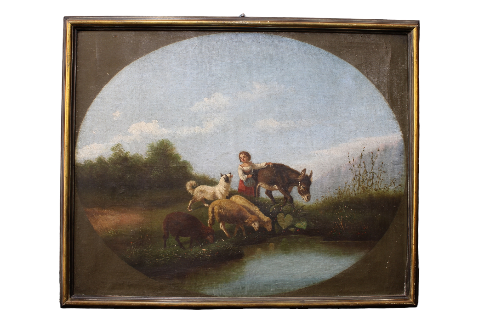 OLIO SU TELA raffigurante pastorella con asinello e armenti cerchia del pittore Antonio Milone Napoli XIX secolo h cm 51 x 64 / cornice h cm 56 x 69