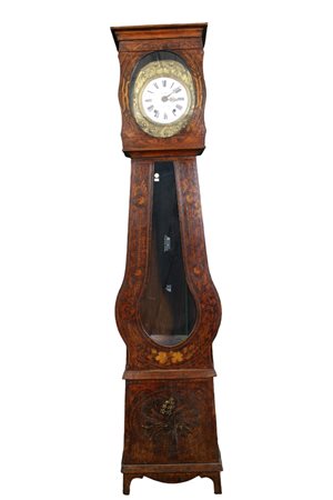 OROLOGIO A TORRE in legno pirografato a fuoco macchina decorata da placca in rame sbalzato cesellato e dorato firmata JULIEN A' VILLAINES-LA JULIEN Francia XIX secolo h cm 200 x 50 x 28