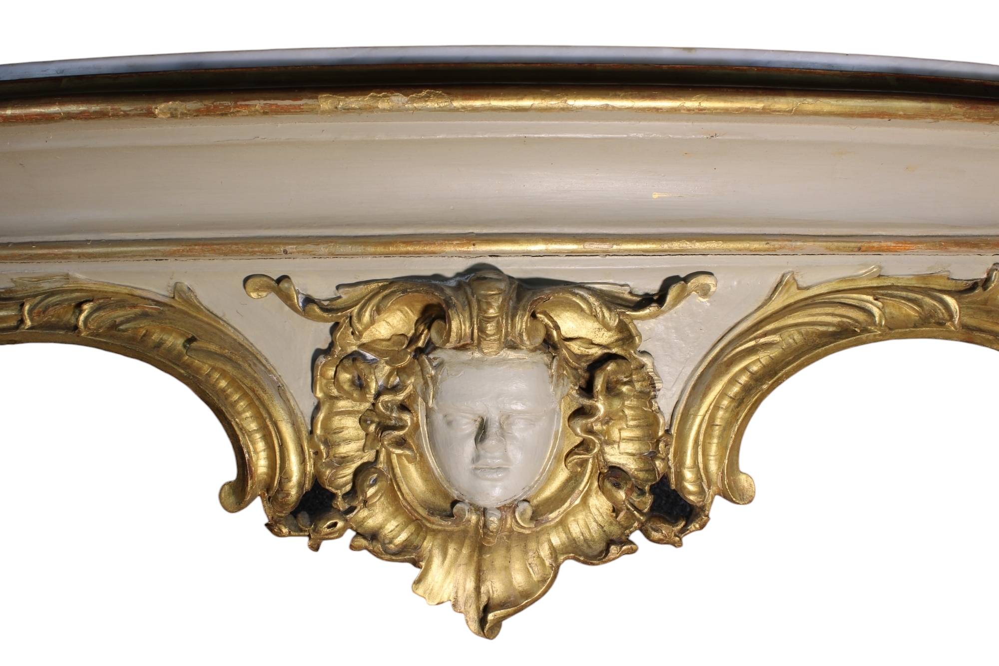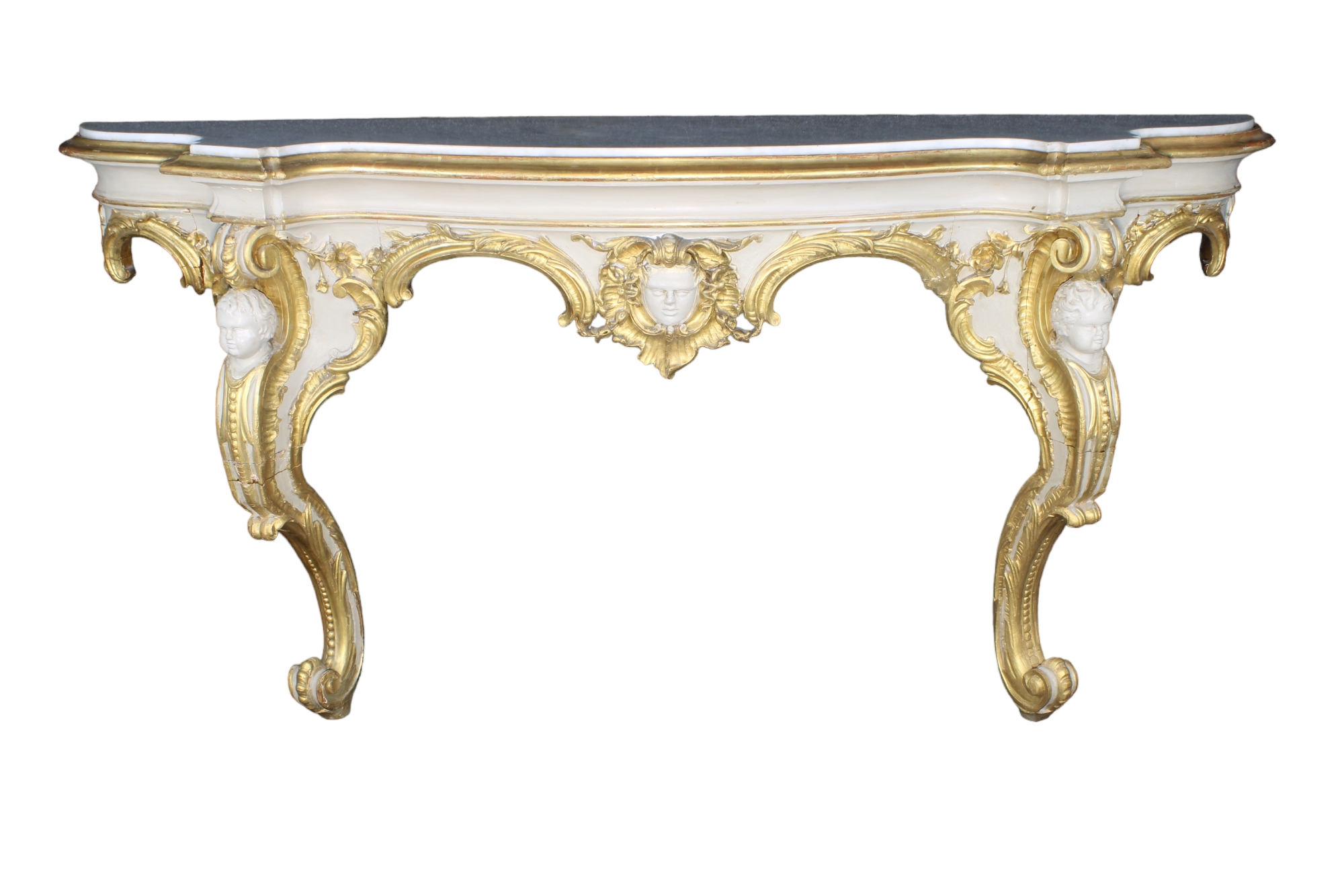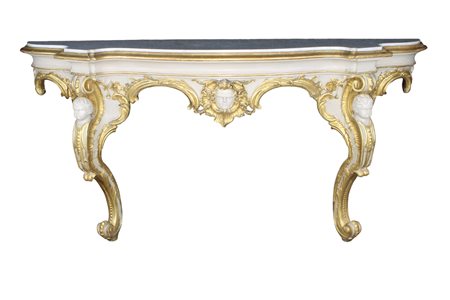 ELEGANTE CONSOLLE DA MURO A DUE GAMBE in legno finemente scolpito, laccato e dorato Sicilia XIX secolo h cm 91 x 187 x 39