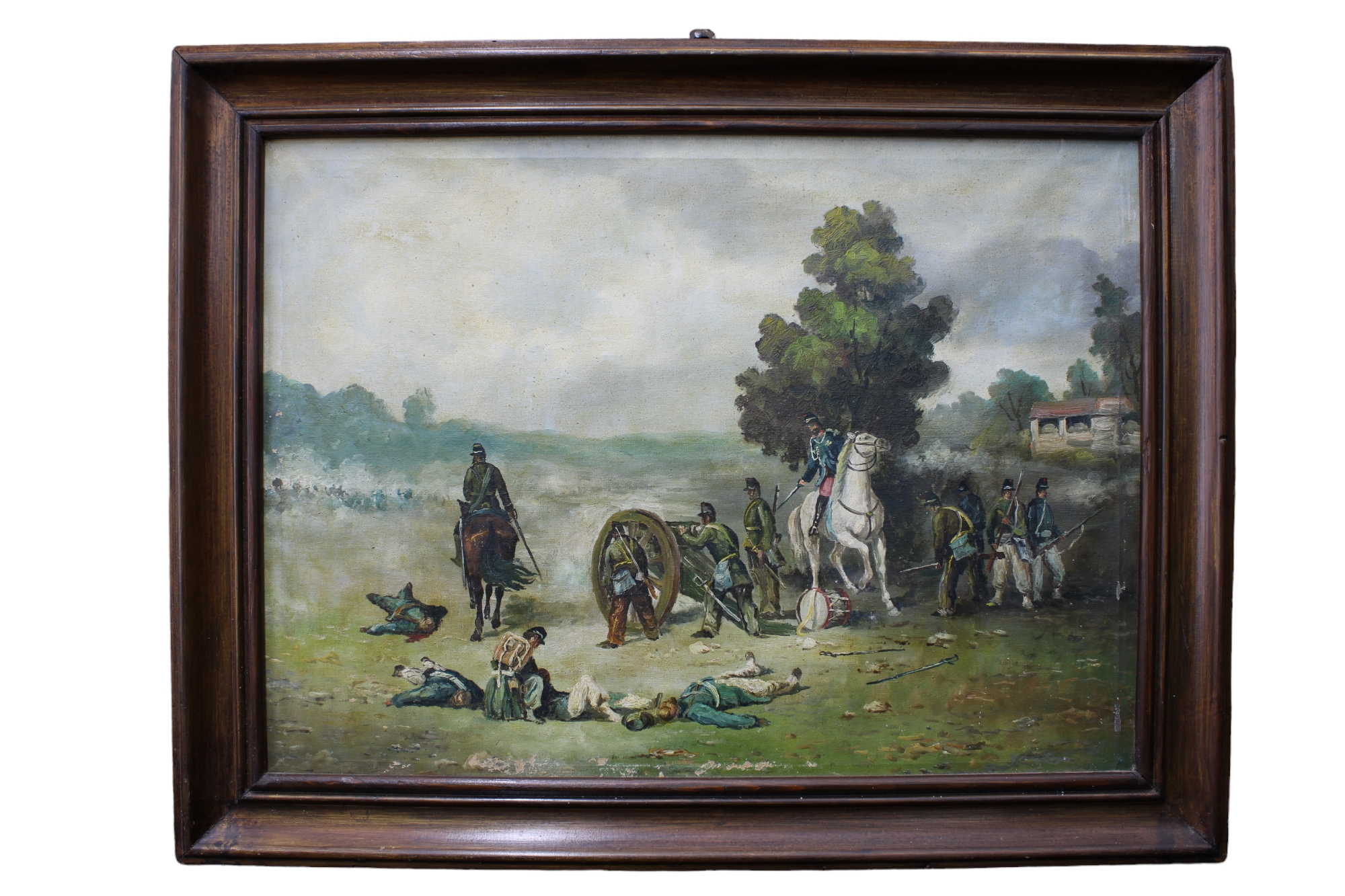 OLIO SU TELA raffigurante battaglie piemontesi scuola italiana XIX/XX secolo h cm 50 x 65 / cornice h cm 61 x 79