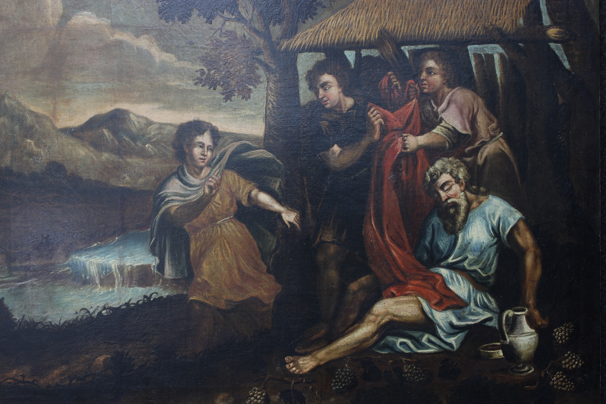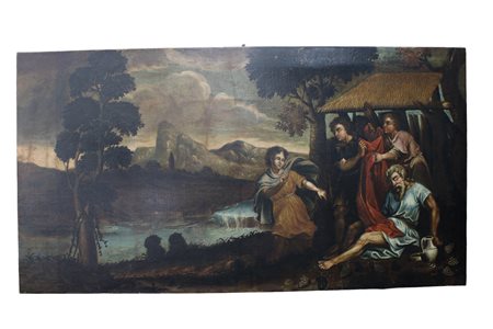 OLIO SU TELA raffigurante scena biblica L'ebrezza di Noè, rintelatura e restauri scuola italiana XVIII secolo h cm 96 x 179