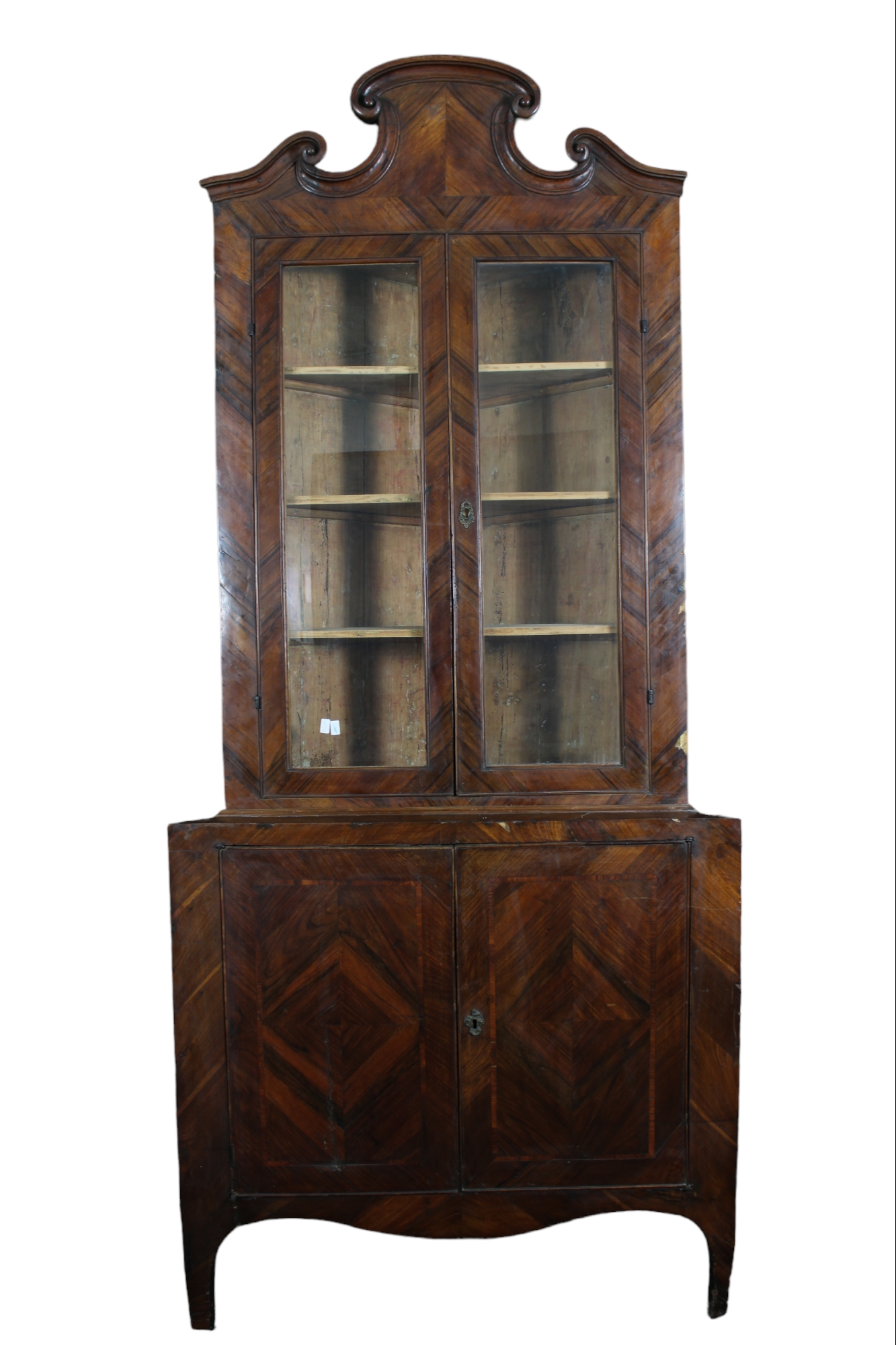 ANGOLIERA DOPPIO CORPO con parte inferiore a due sportelli e parte superiore a vetrina in legno di noce Sicilia XVIII secolo h cm 246 x 107 x 75