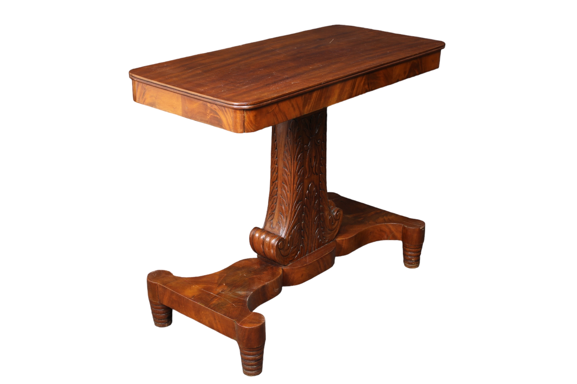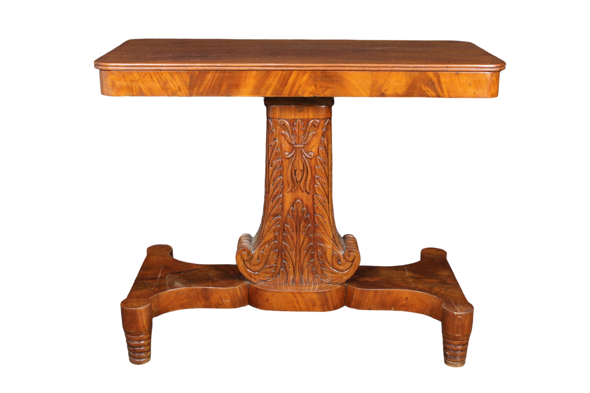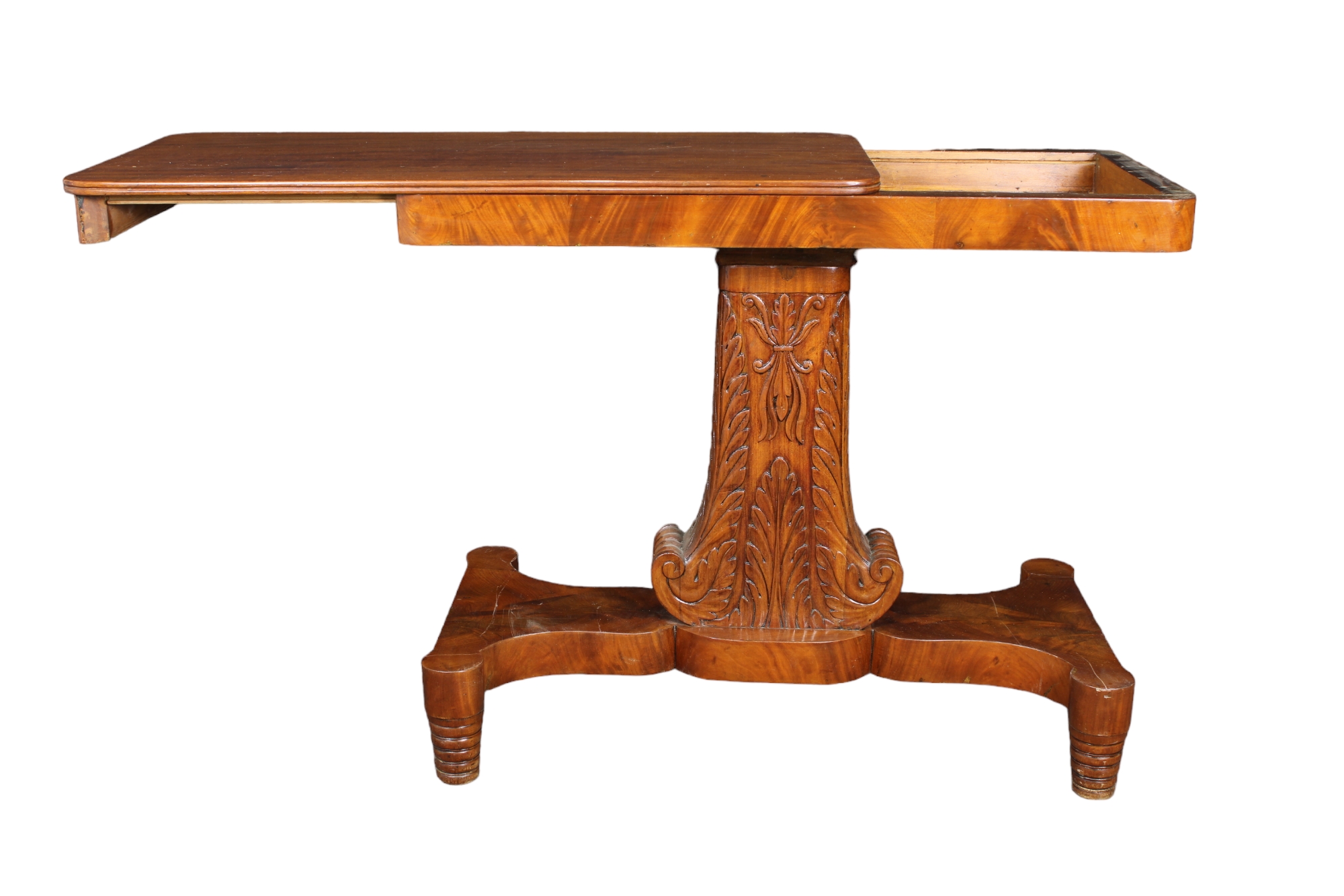TAVOLINO DA CENTRO in legno di piuma di mogano con piede riccamente scolpito a foglie d'acanto e piano scorrevole Sicilia XIX secolo h cm 81 x 98 x 45,5