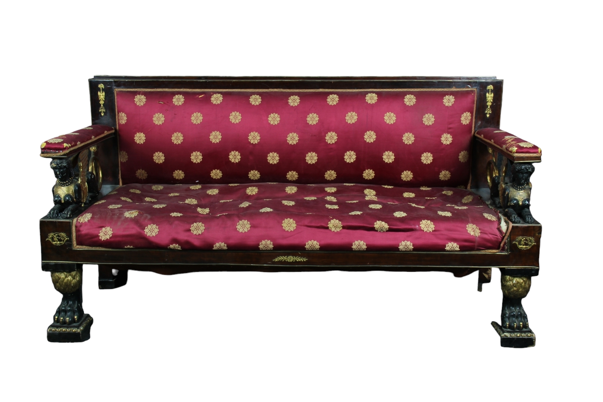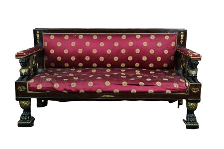 DIVANETTO 3 POSTI legno in piuma di mogano, arricchito da sculture raffiguranti sfinge alate in legno scolpito. Laccato e dipinto, piedi leonini e applicazioni in bronzo dorato Sicilia XIX secolo h cm 94 x 173 x 63