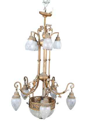 LAMPADARIO A DIECI LUCI in metallo dorato e bocce in vetro manifattura siciliana fine XIX primi XX secolo h cm 128 x 77