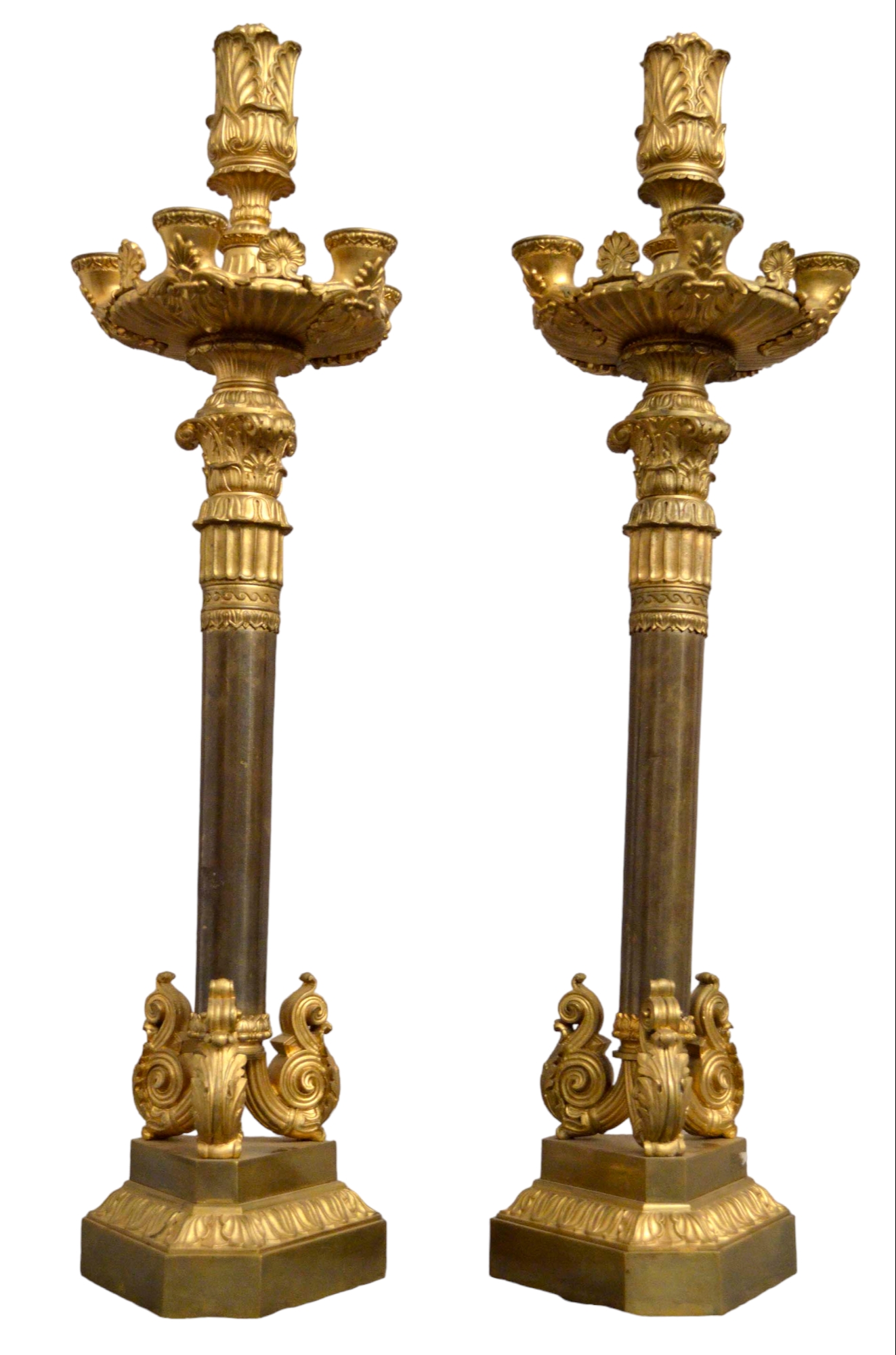 COPPIA CANDELIERI CARLO X in bronzo dorato e brunito Francia 800 h cm 85