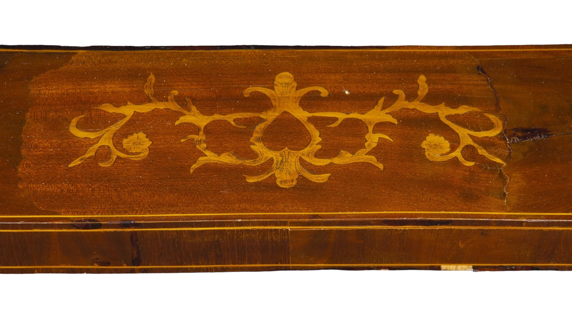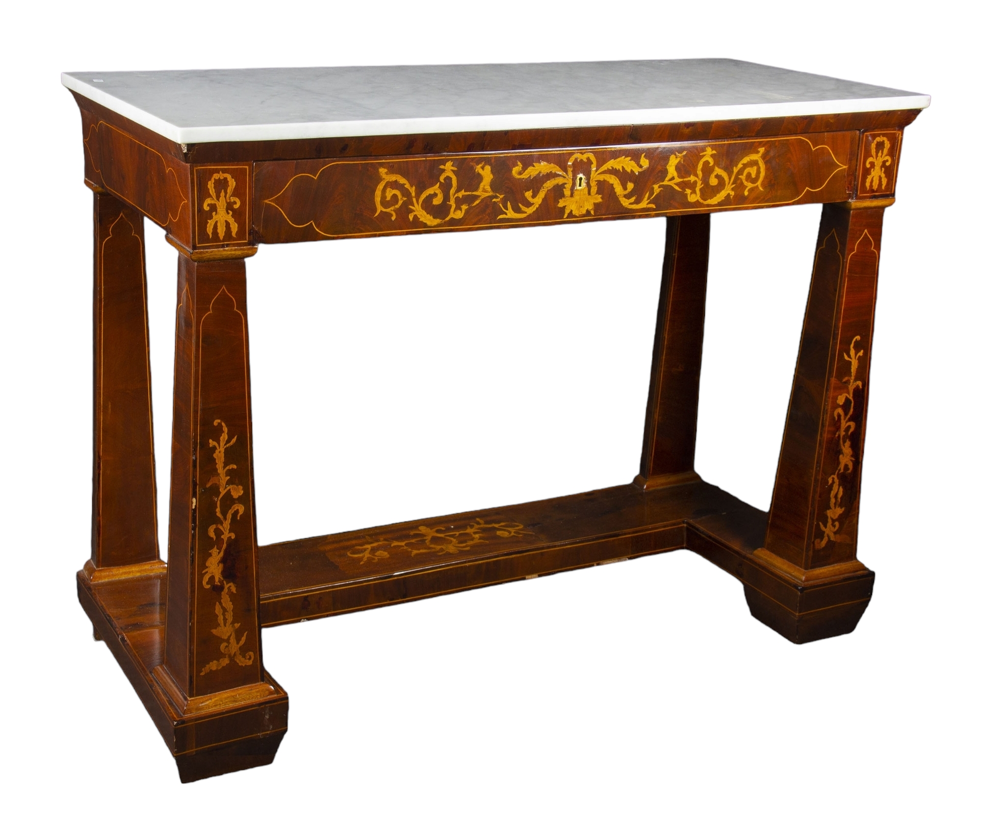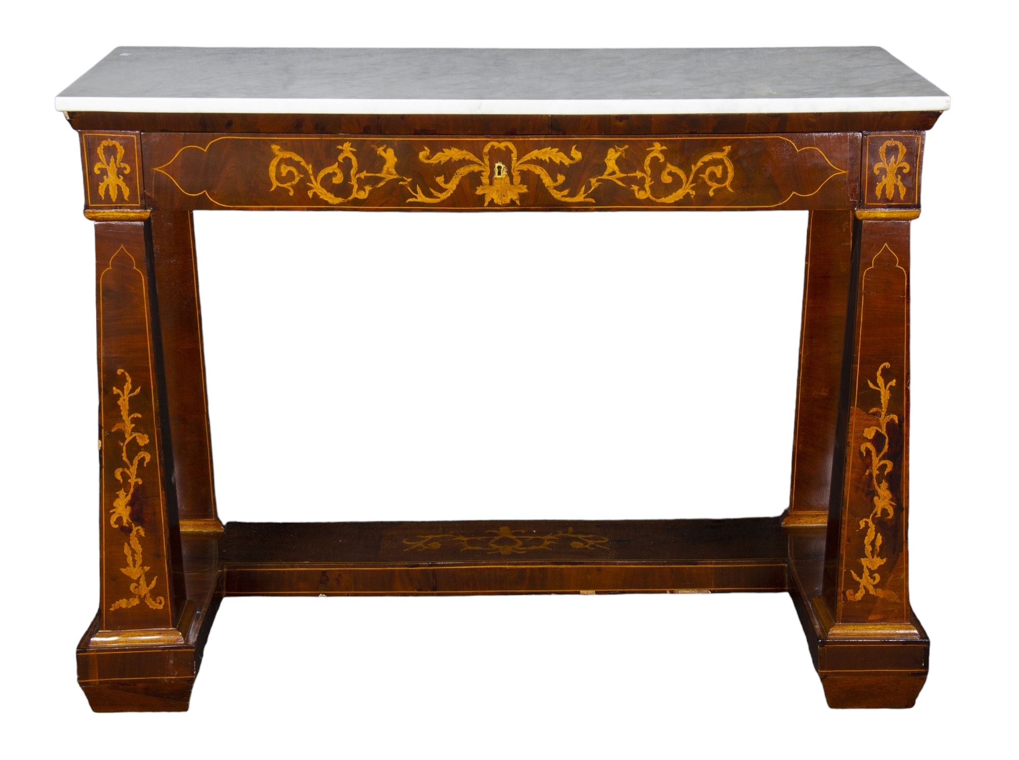 CONSOLLE CARLO X in mogano con tarsie in bosso, piano in marmo bianco di Carrara, gambe piramidali raccordate da base decorata da tarsie Sicilia XIX secolo h cm 97 x 134 x 54