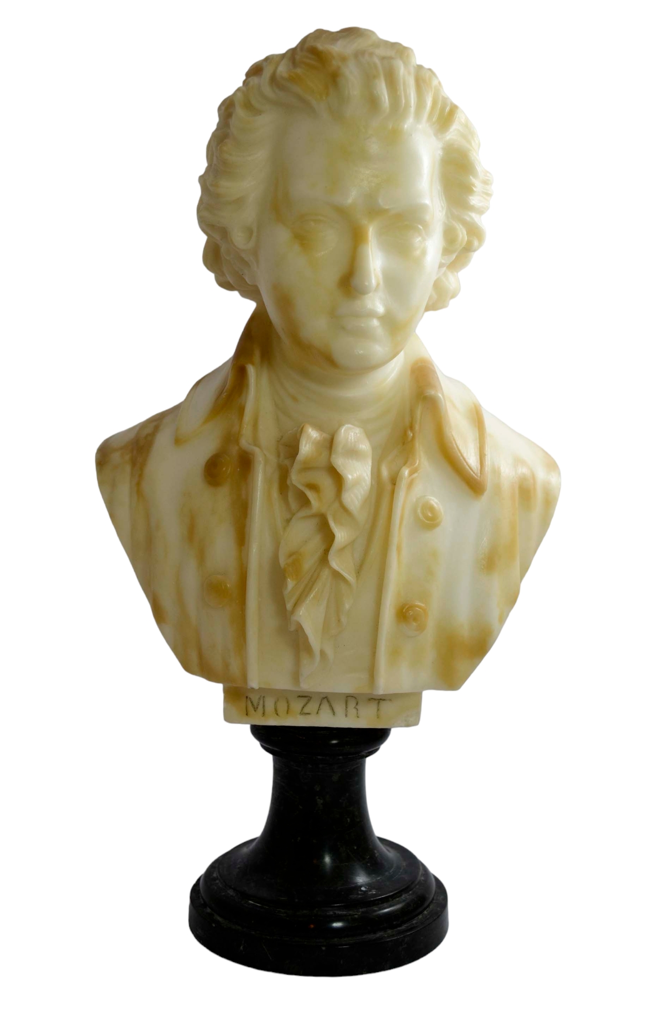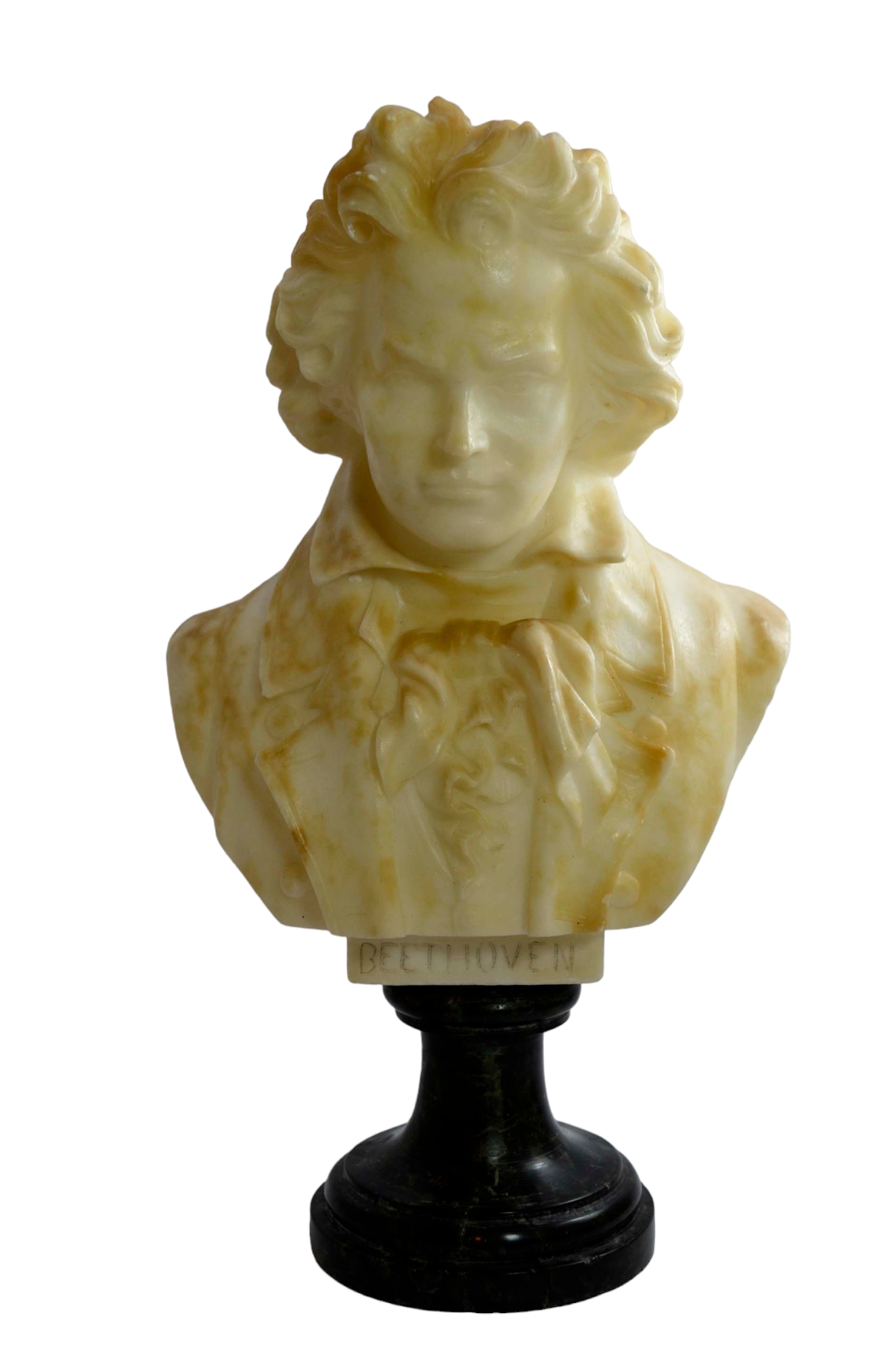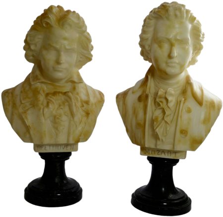 DUE BUSTI in alabastro su base a colonna, raffiguranti Beethoven e Mozart Italia XX secolo h cm 31