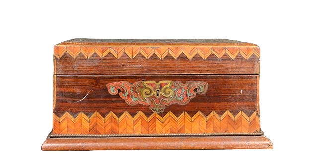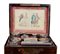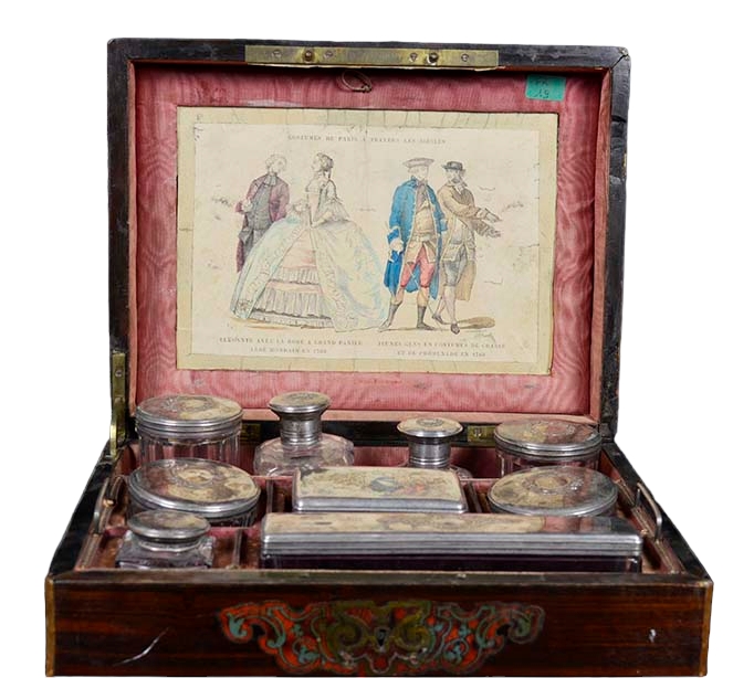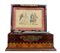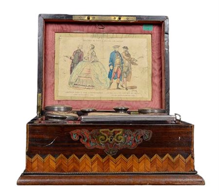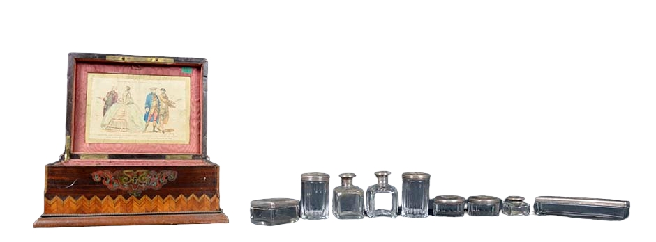 SCATOLA NECESSAIRE in legno lastronato, in palissandro , arricchita da intarsi in bois de rose , ottone , smalti e materiale pregiato. All' interno boccette e scatole in vetro ed argento Francia XIX secolo h cm 15 x 31 x 24,5