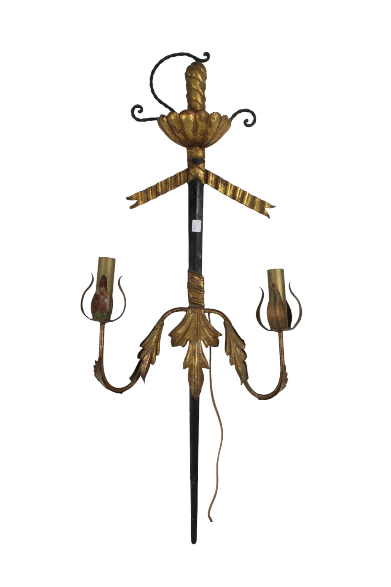 CURIOSO APPLIQUES A DUE LUCI in ferro dorato e dipinto raffigurante spada maestranze italiane primi XX secolo h cm 92 x 40