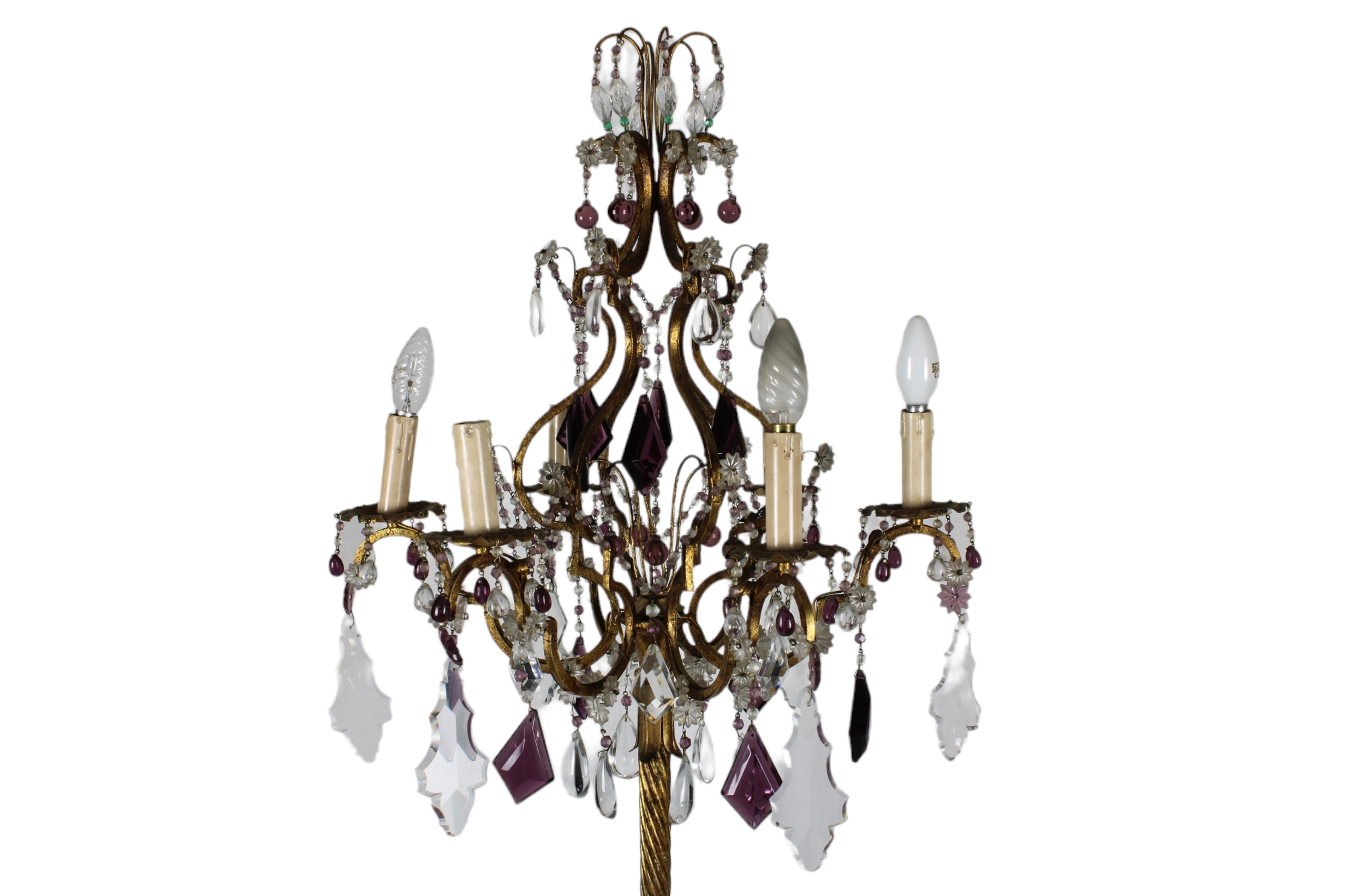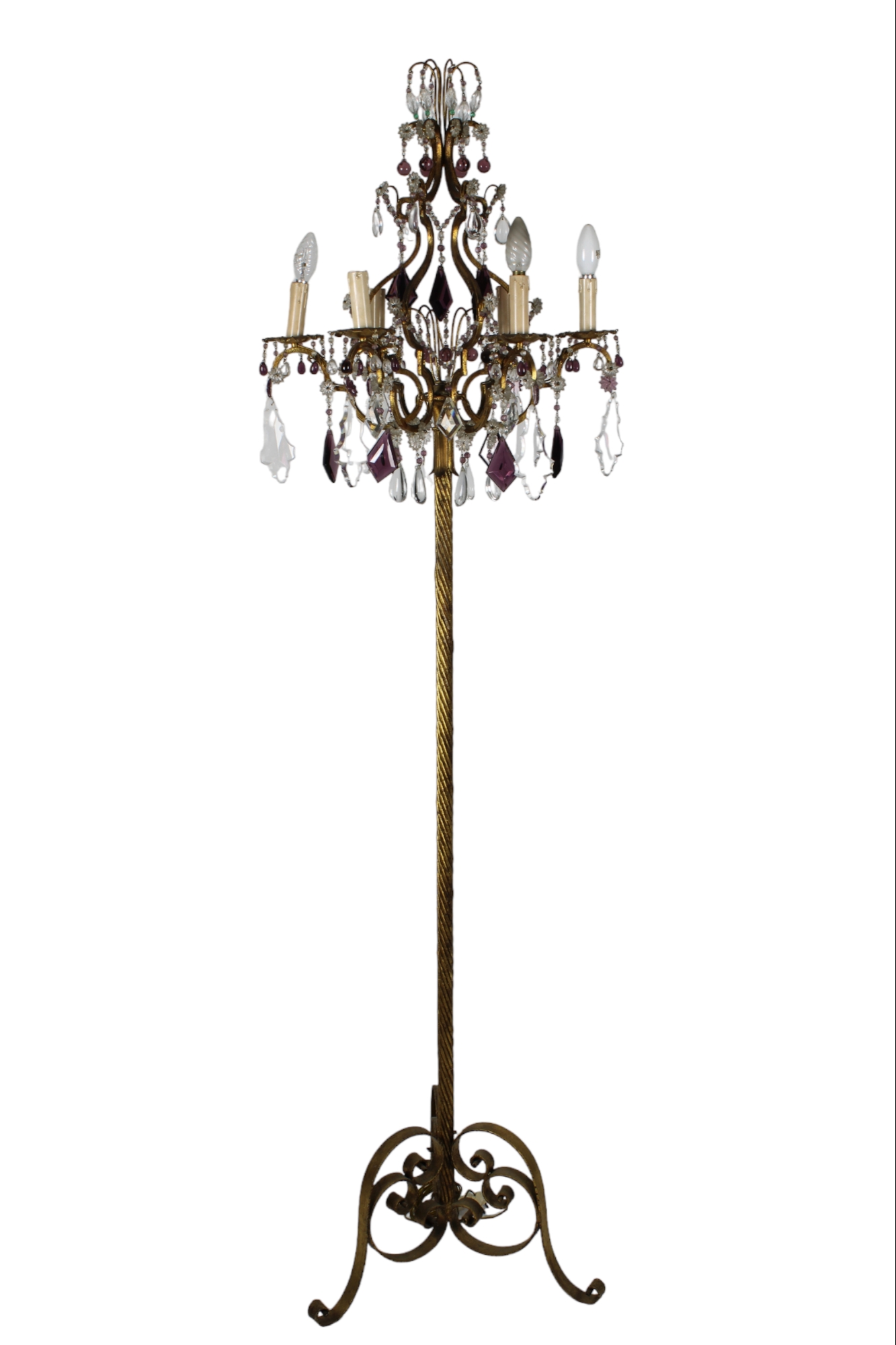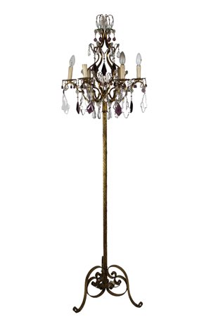 PIANTANA A SEI LUCI in ferro dorato, arricchita da pendenti in cristallo e vetri colorati manifattura italiana XIX/XX secolo h cm 187 x 53