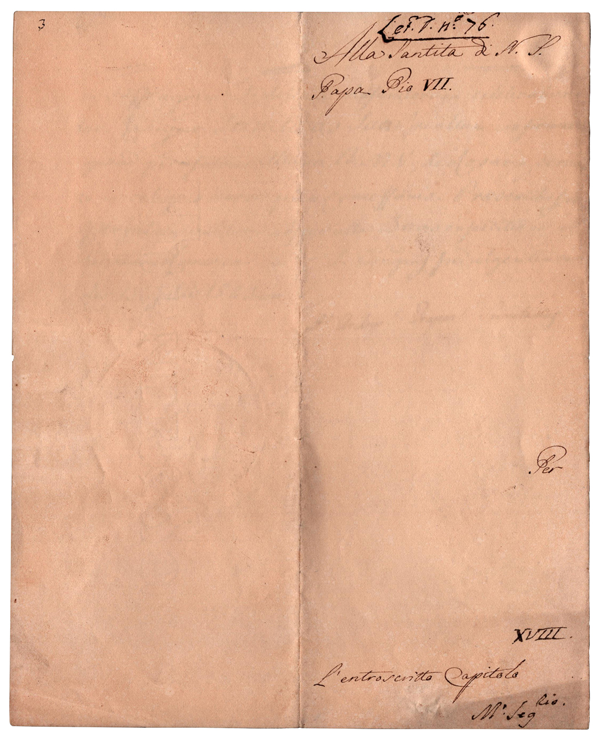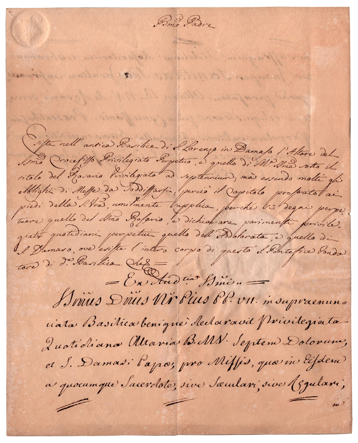 Documento manoscritto datato 'die 15 Julii 1823', scritto un mese prima della morte del Pontefice. La supplica è rivolta al Santo Padre: "...perché si degni perpetuare..." alcuni altari nella Basilica di San Lorenzo in Damaso, presso Roma, "... quello del SSmo Rosario...quello del'Addolorata e quello di S.? Damaso, ove esiste' l'intero corpo di questo S.? Pontefice fondatore di I.a? Basilica." La Basilica di San Lorenzo in Damaso è una delle chiese di Roma dalle origini più antiche. La tradizione vuole che nel 1577 il Cardinale Alessandro Farnese il giovane abbia fatto traslare le spoglie di Papa Damaso I, insieme a quelle di Papa Eutichiano, nella basilica. Riccamente adornata di opere d’arte, nel 1798 fu trasformata in scuderie per le truppe francesi di Napoleone e gravemente deteriorata. Venne quindi restaurata da Giuseppe Valadier nel 1807 e nel 1816-1820, quando fu eliminata la confessione che, insieme all’abside, Gian Lorenzo Bernini aveva realizzato nel 1640 per volere del cardinale Francesco Barberini, trasformando il presbiterio in sontuose forme barocche. Ulteriori restauri furono eseguiti nel 1868 da Virginio Vespignani che ripristinò le linee rinascimentali della chiesa, eliminando quasi del tutto gli interventi successivi. La chiesa assunse così l’aspetto attuale, fatta eccezione del soffitto ligneo, ricostruito in seguito all’incendio del 31 dicembre 1939. Due pagine in-8, su bifolio, sigillo in cera sotto carta.