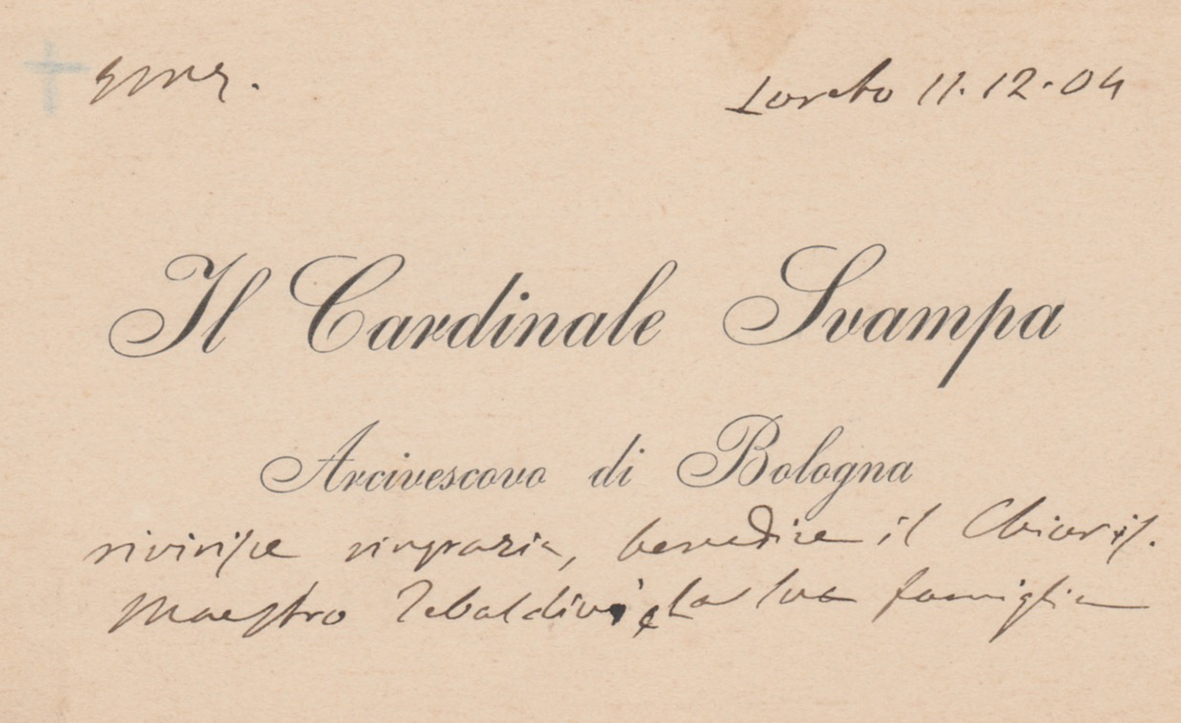 Righi autografi su biglietto da visita dell'arcivescovo di Bologna e Cardinale Domenico Svampa, datati 'Loreto 11.12.1904', indirizzati al compositore, musicologo e direttore d'orchestra Giovanni Tebaldini. Domenico Svampa nel 1861 entrò nel Seminario di Fermo, dove nel 1867 conobbe don Giovanni Bosco, venuto a far visita all'arcivescovo Filippo de Angelis. Svampa nel 1872 vinse il concorso d'ammissione ed entrò nel Seminario Pio di Roma, poi accorpato nel 1913 dal Pontificio Seminario Romano Maggiore, insieme ad altri due seminaristi, Roberto Papiri di Montefortino (futuro arcivescovo e principe di Fermo) e Raffaele Astorri (futuro protonotario apostolico e vicario generale di Fermo). Dopo un breve periodo passato nella sua terra natale, papa Leone XIII lo chiamò ad insegnare al Seminario di Sant'Apollinare. L'11 dicembre 1886 venne nominato cameriere segreto soprannumerario di Sua Santità ed il 28 maggio 1887 venne nominato vescovo di Forlì. Nel concistoro del 18 maggio 1894 papa Leone XIII lo proclamò cardinale destinandolo all'arcidiocesi di Bologna. Il 22 giugno ricevette la nomina a cardinale presbitero di Sant'Onofrio e fino alla creazione del cardinale Pietro Maffi, effettuata da Pio X, fu il porporato italiano più giovane. Accolse le più svariate iniziative, ad esempio, istituì le casse rurali, il giornale cattolico l'"L'Avvenire d'Italia", il “Piccolo credito romagnolo” e un istituto d'istruzione per il popolo insieme ai salesiani fondati proprio dal suo caro amico Don Bosco. Il 30 maggio 1903 pubblicò la notificazione per la festa del Corpus Domini per compendiare l'enciclica di papa Leone XIII, "De Sanctissima Eucharistia". Nell'agosto dello stesso anno partecipò al conclave, durante il quale era uno dei sette cardinali con maggiori probabilità di essere eletto papa, ma un ictus gli paralizzò il viso durante le cerimonie di apertura e gli rese difficile parlare, lo afflisse e per questo non fu scelto e votò per il cardinale Sarto, futuro Papa Pio X. Il cardinale Svampa fu precursore della riconciliazione fra Stato Italiano e Chiesa cattolica e si ritrovò al centro di un delicatissimo caso diplomatico che creò non poco scalpore in Italia e in Europa. Vittorio Emanuele III si recò a Bologna nel 1904; il cardinale, conscio dei rapporti tesi fra Santa Sede e Monarchia, desiderava poter accogliere il Re senza contrariare il Pontefice, e per tale motivò inviò in Vaticano il legale della Curia bolognese (avvocato R. Ambrosini) per chiedere il permesso di ossequiare il monarca italiano. Il Papa in persona incoraggiò il cardinale Svampa. Nelle ore successive l'alta nobiltà bolognese ed i rappresentanti della classe dirigente organizzarono un banchetto per rendere onore al Re e ovviamente l'invito fu esteso anche al cardinale Svampa, il quale accettò di partecipare nonostante non avesse ricevuto ancora un'approvazione esplicita dalla Santa Sede. L'unico inconveniente fu che il giorno del banchetto combaciava con un giorno di digiuno e quindi, per non creare disagi al cardinale, si organizzò un secondo "menù di magro". Proprio da questo espediente prese il titolo il libro di Giulio Andreotti, "Pranzo di magro per il cardinale". Purtroppo la lettera con il consenso del Papa - limitato ad un incontro personale e riservato di Svampa con il Re - arrivò in ritardo ed il cardinale partecipò al pranzo con il Re, suscitando non poco scalpore nei cattolici italiani e bolognesi. Tale evento rappresentava, per il popolo, un chiaro segno di distensione nei rapporti fra Santa Sede e Monarchia; il cardinale stesso ricevette numerosissimi biglietti e lettere di ringraziamento e lode da parte di molte persone legate soprattutto dell'area socialista e progressista e ciò non fu ben visto da Roma. Il Pontefice in persona riprese il cardinale Svampa scrivendo più lettere. L'umiliazione per lo Svampa fu enorme e lo spinse a rassegnare le dimissioni, che non furono però accolte. Egli continuò il suo ministero dalla malattia e dai tragici lutti che colpirono la sua famiglia nelle Marche. Il cardinale si spense il 10 agosto 1907 lasciando una grandissima eredità spirituale e la grande responsabilità di aver incominciato il lungo processo di riconciliazione fra Stato Italiano e Chiesa cattolica. Per tutto ciò che fece il New York Times gli dedicò ventidue articoli.