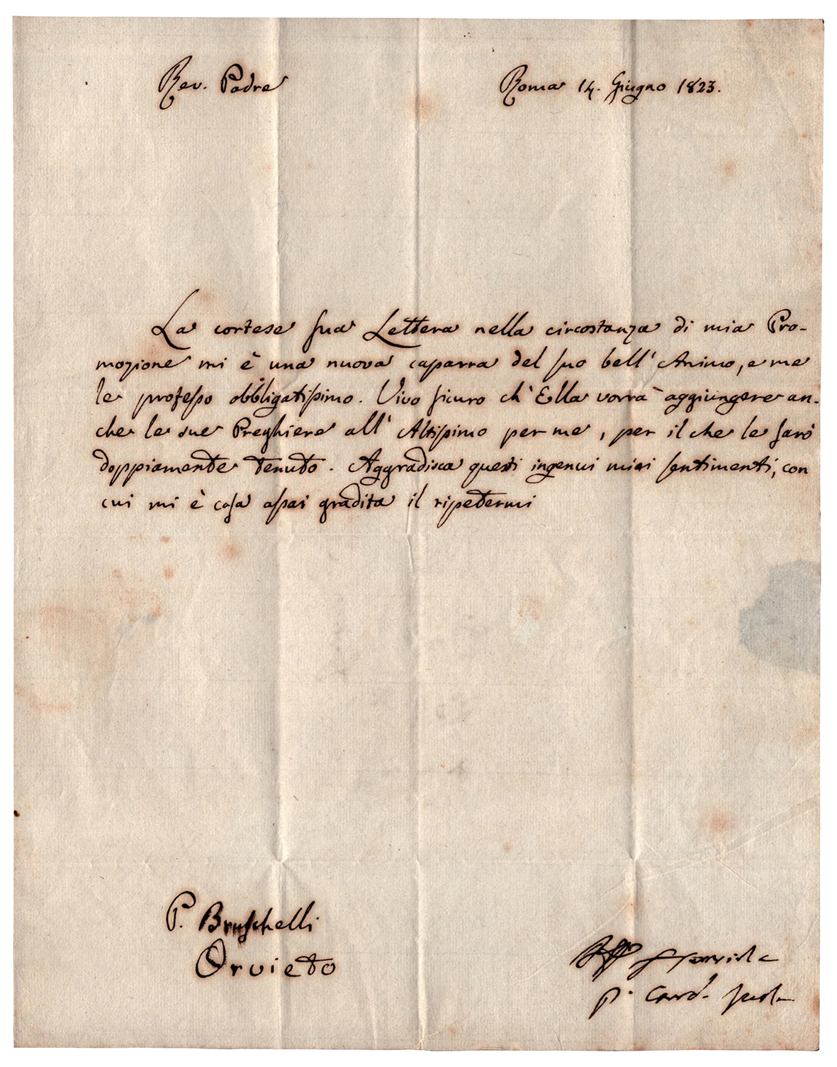 Lettera firmata, datata 'Roma 14 Giugno 1823' del prelato, creato Cardinale da Pio VII nel concistoro del 10 marzo 1823, Cardinale vicario di Roma dal 1824 alla morte, Giacinto Placido Zurla. La missiva è diretta a Padre Bruschelli, reggente della chiesa di Sant'Agostino a Orvieto, nella quale lo ringrazia per la: "...mia Promozione...". "Vivo sicuro ch'Ella vorrà aggiungere anche le sue Preghiere all'Altissimo per me...". Una pagina in-8, su bifolio. Indirizzo e traccia di sigillo alla quarta.