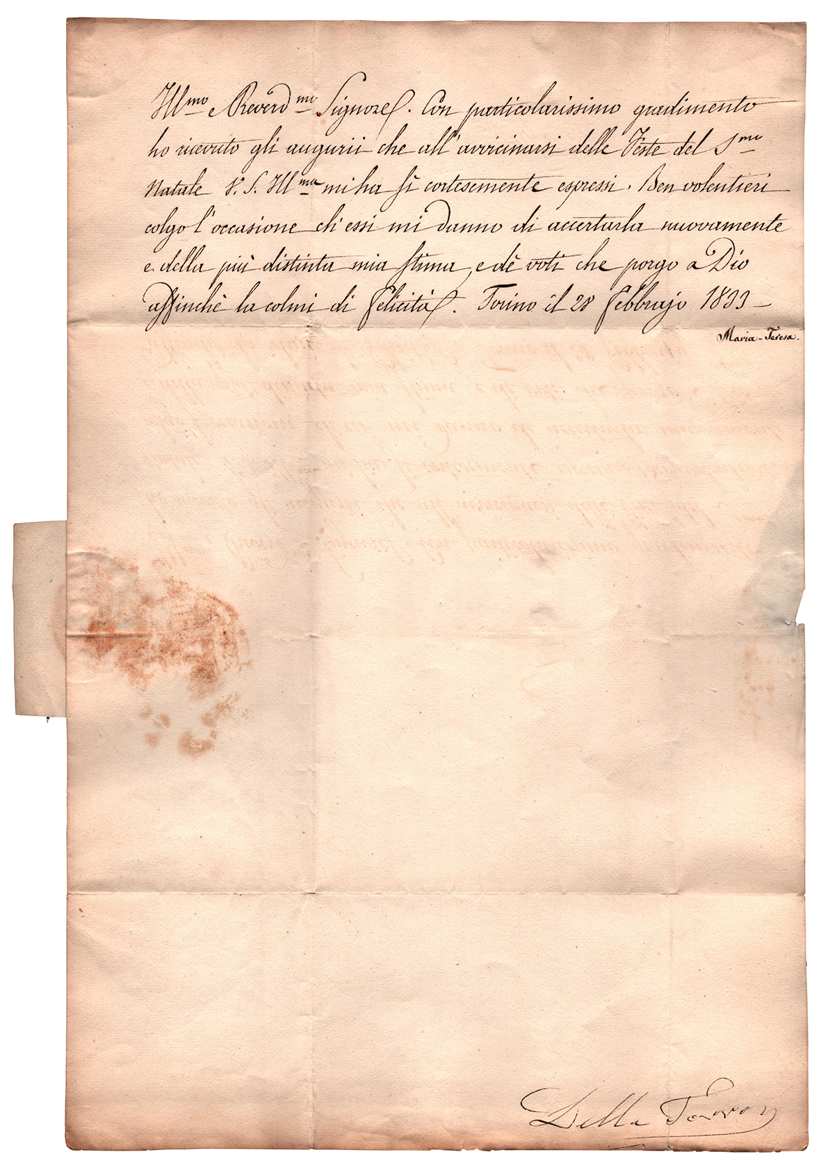 Lettera firmata, datata Torino il 20 febbrajo 1833 della Regina di Sardegna, consorte di Carlo Alberto di Savoia, e madre del "Re galantuomo", diretta al Cardinal Fesch (1763-1839), zio di Napoleone Bonaparte (in quanto fratello della madre Letizia Ramolino). "Con particolarissimo gradimento ho ricevuto gli augurii che all'avvicinarsi delle Feste del S.mo Natale V.S. Ill.ma mi ha sì cortesemente espressi...". Una pagina in-4, indirizzo manoscritto e sigillo in cera sotto carta alla quarta.