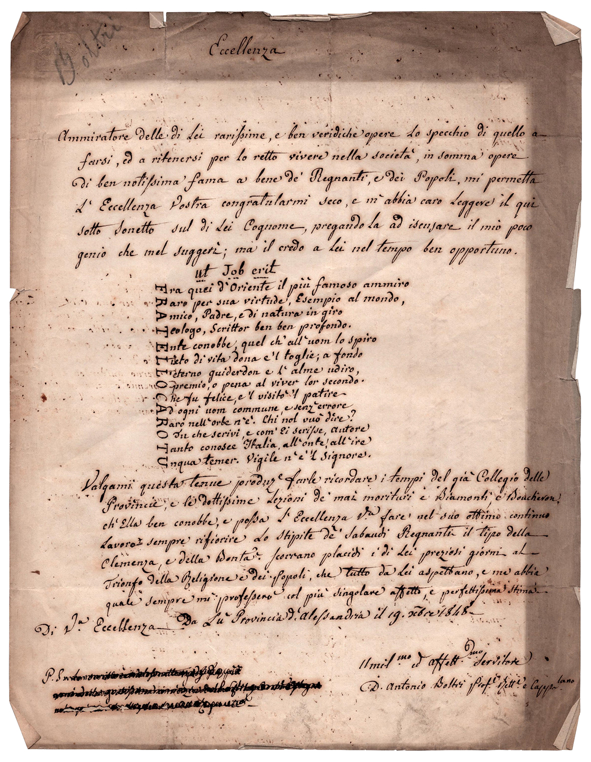 Interessante lettera cifrata, data 19 ottobre 1848, in cui l'avvocato Giuseppe Antonio Boltri, giudice regio, viceprefetto di Alessandria, si rivolge a Vincenzo Gioberti, allora presidente della Camera dei Deputati del Regno di Sardegna con il chiaro riferimento alla adesione alla massoneria. Moltissimi ed espliciti i richiami, dal sauto "Fratello Caro", alla menzione di Gioberti quale "più famoso fra quei d'Oriente", con riferimento al Grande Oriente d'Italia. Il significato della lettera è coperto dall'elogio della monarchia e dall'evocazione del trionfo della religione.