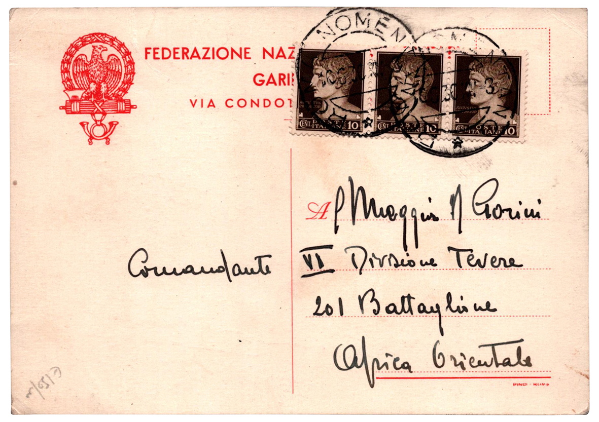 Lettera autografa firmata, su cart. post. viaggiata datata Roma 12 giugno 1936 XIV del nipote di Giuseppe Garibaldi (figlio di Ricciotti), consigliere nazionale della Camera dei Fasci e delle Corporazioni (1939) e autore del volume "Fascismo garibaldino" (1928), diretta al Maggior Gorini. "Tutti i più cari ricordi, i più vivi rallegramenti e tutti gli auguri fervidissimi…".