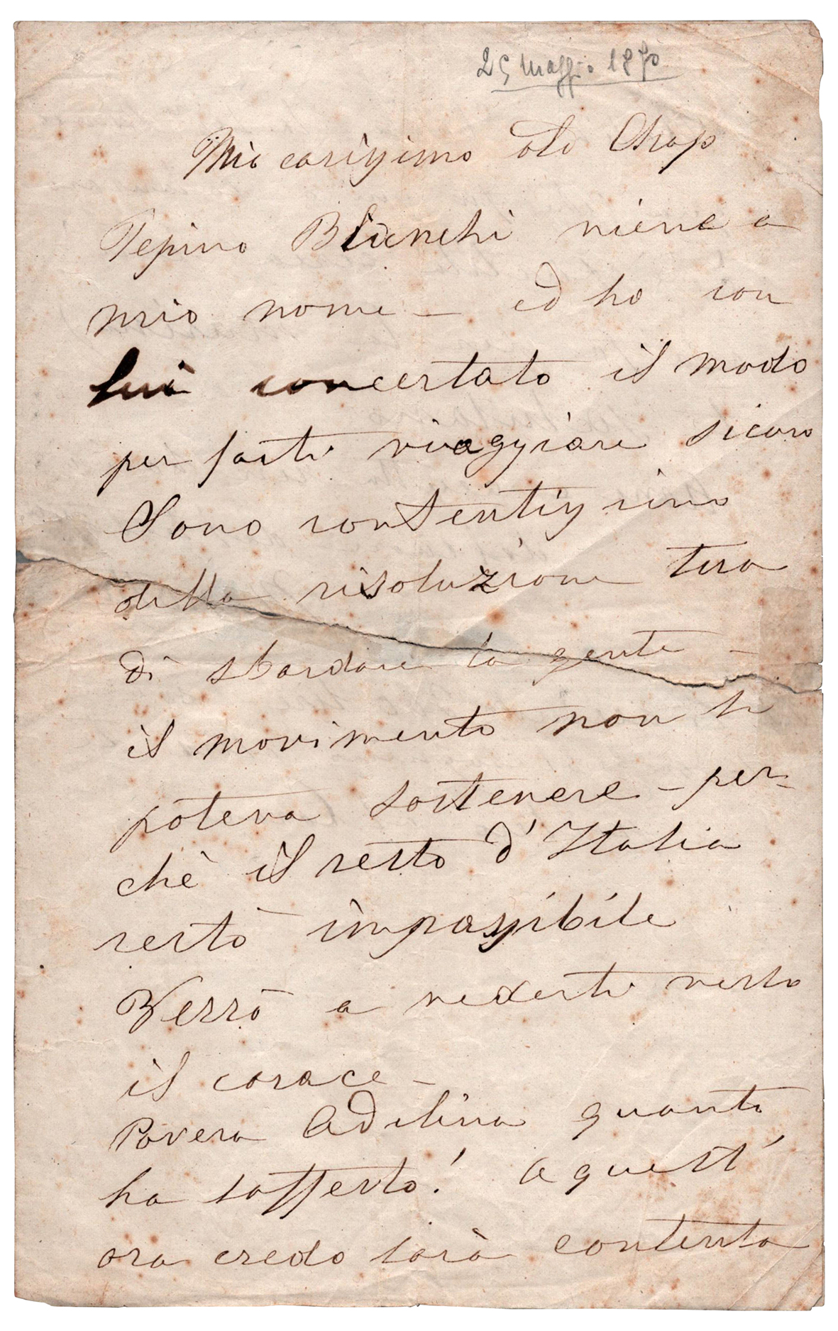 Lettera autografa e firmata del figlio di Garibaldi ad un amico. "Pepino Bianchi viene a mio nome, ed ho con lui concertato il modo per farti viaggiare sicuro. sono contessimo della risoluzione tua di sbandare la gente. Il movimenton non si poteca sostenere perché il resto d'Italia restò impassibile. ... Povera Adelina quanto ha sofferto!".