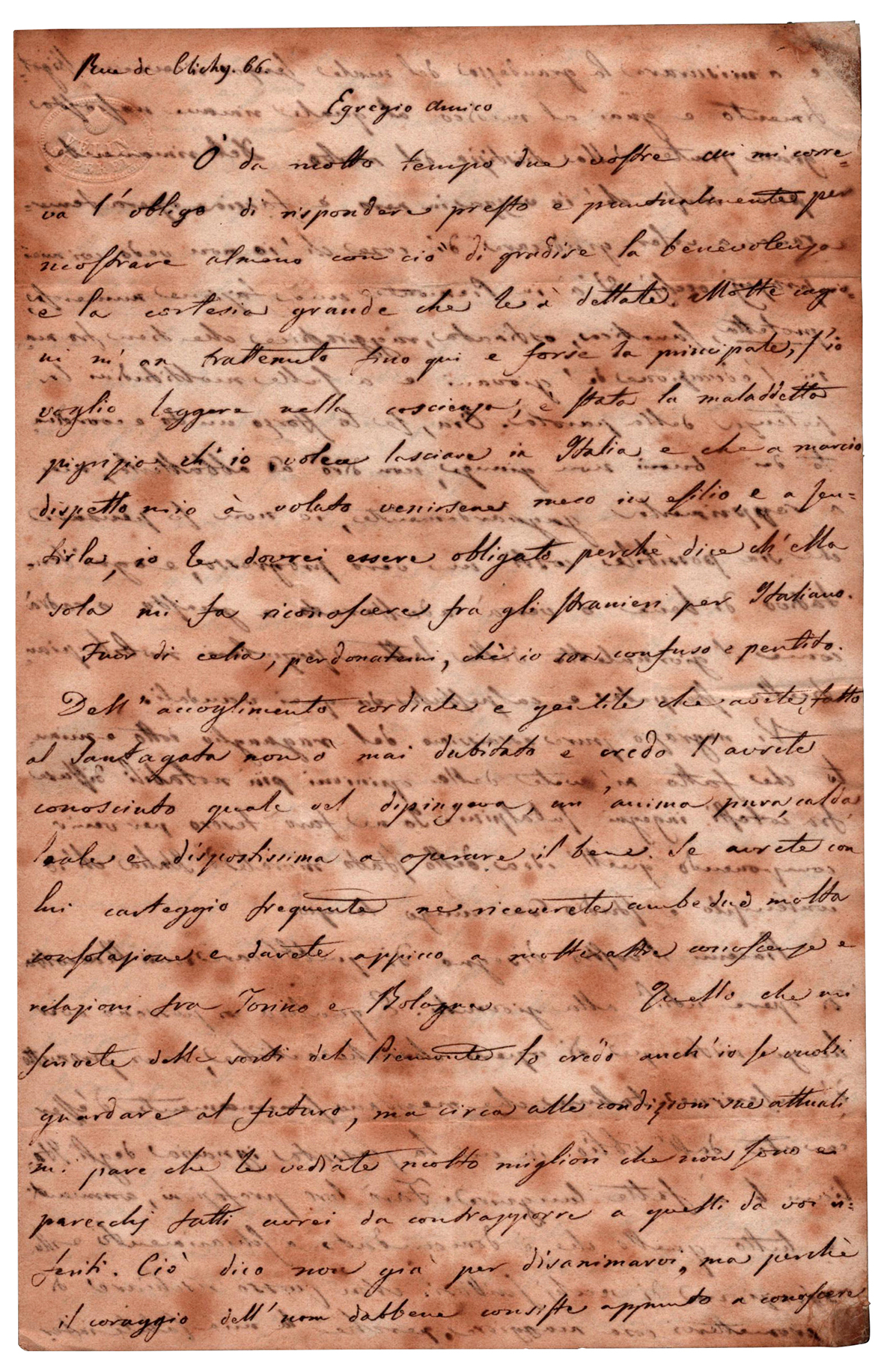 Importante lettera autografa firmata indirizzata all’Avv. Giovanni Edoardo Brignone. Scritta alla vigilia del ’48 la lettera anticipa i temi della discussione che saranno poi affrontati dal 'Congresso Nazionale per la Confederazione italiana' della cui Assemblea Costituente Mamiani, Gioberti e Romeo furono presidenti e il Brignone fu segretario generale. Parigi 22 Xbre del 1847. Il testo è tutto di estremo interesse. Estrapoliamo solo alcune righe dalla seconda pagina. "V'a' in Piemonte una fazione numerosa protetta, fanatica, ostinata, raggiratrice, che tien fra mani l'educazione de' giovani ed à sulle moltitudini la potenza della parola. Ora, se lo sforzo unito e coordinato dei buoni non giunge, non dico ad abbatterla, ma a repprimerla gagliardamente, io non so pensare che sia possibile costì vero progresso, e ogni tentativo di bene o verrà adulterato e guasto, o cadrà come il giornaletto delle letture popolari, nobile pianticella sterpata e calpestata da quei vandali...". Tre pagine in-8 . Indirizzo alla 4a.