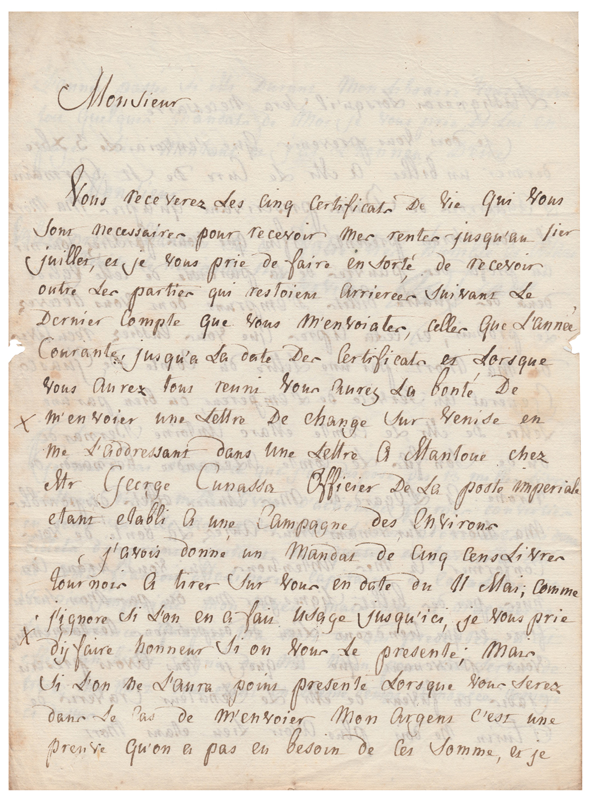Ufficiale al servizio dell'esercito imperiale del Sacro Romano Impero (1742-1780), fratello del famoso scrittore e avventuriero Ottaviano Guasco, nel 1771 fu nominato Feldzeugmeister (generale di artiglieria). Lettera autografa firmata, datata Venise Le 1ier juillet 1774, diretta alla banca parigina Tourton et Baur (fondata nel 1754), su alcune operazioni finanziarie. "L'anné passé si Mr. Durant mon Libraire vous presentait quelques mandats de moi je vous prie de lui en payer le montant...". "Je vous dirai d'avance que j'ai disposé des 13 milles Livres...". Tre pagine in-8, su bifolio. Indirizzo autografo alla quarta.