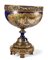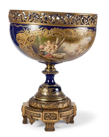 Grande alzata in porcellana di Sevres montata in bronzo dorato, fine XIX secolo, con due dipinti raffiguranti una scena di paesaggio e una scena con putti