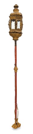 Antica lanterna in lamiera dorata, di forma esagonale, poggiante su bastone in legno decorato con elementi scolpiti e dorati