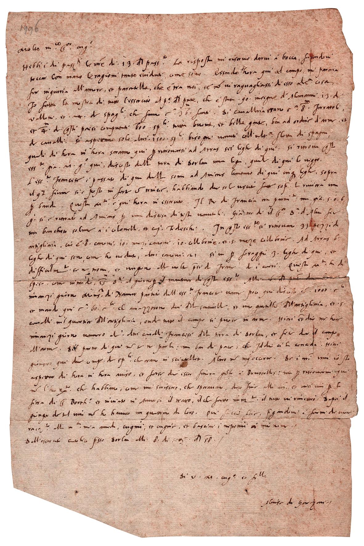 Lettera interamente autografa del patrizio veneto Alvise Garzoni, datata 6 ottobre 1558 e inviata al cugino Agostino Tiepolo. Il documento ci restituisce un’interessantissima testimonianza sull’andamento della guerra in corso nei Paesi Bassi contro l'impero spagnolo a sostegno del Re di Francia Enrico II durante la Guerra d’Italia che nel 1559 si concluse con la famosa pace di Cateau-Cambrésis.
