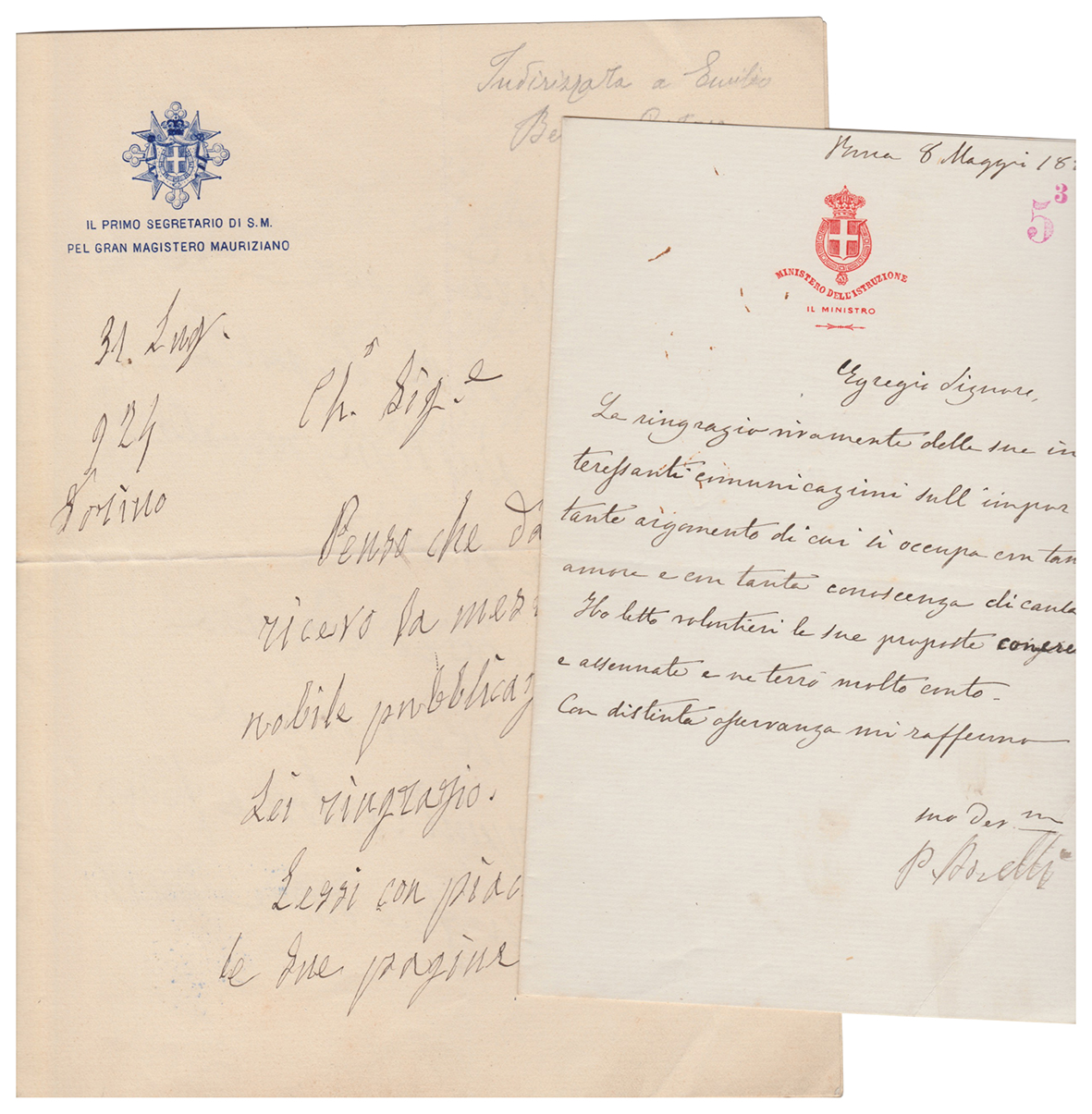 Illustre giurista, docente e uomo politico, fu primo ministro del Regno d'Italia dal giugno 1916 all'ottobre 1917, dimissionario dopo la fatale sconfitta di Caporetto. Due lettere firmate (la prima, datata 31 Lug. 1924 Torino, integralmente autografa; la seconda, datata Roma 8 maggio 1888 di mano del segretario). Si riporta un passo a titolo di esempio: "Lessi con piacere le due pagine schiette e gagliarde e vere, se presso tutte le genti amore e giustizia prevalessero alla forza. Lessi con commozione le pagine in cui vive il Gen. Scarpini: valore e fede...". Quattro pagine in-8 in totale, carta intestata.